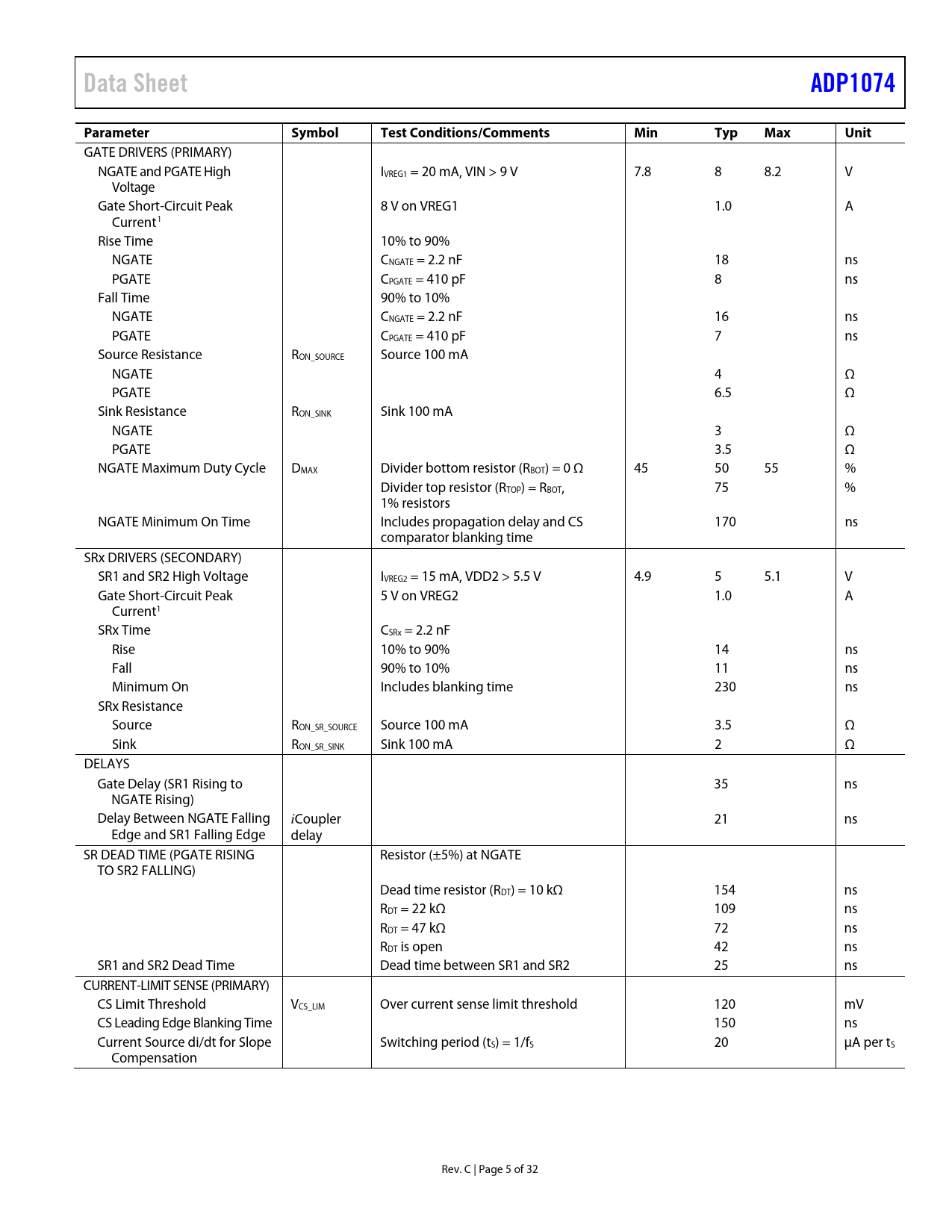 link to page 7 link to page 7 Data SheetADP1074ParameterSymbolTest Conditions/CommentsMinTypMaxUnit GATE DRIVERS (PRIMARY) NGATE and PGATE High IVREG1 = 20 mA, VIN > 9 V 7.8 8 8.2 V Voltage Gate Short-Circuit Peak 8 V on VREG1 1.0 A Current1 Rise Time 10% to 90% NGATE CNGATE = 2.2 nF 18 ns PGATE CPGATE = 410 pF 8 ns Fall Time 90% to 10% NGATE CNGATE = 2.2 nF 16 ns PGATE CPGATE = 410 pF 7 ns Source Resistance RON_SOURCE Source 100 mA NGATE 4 Ω PGATE 6.5 Ω Sink Resistance RON_SINK Sink 100 mA NGATE 3 Ω PGATE 3.5 Ω NGATE Maximum Duty Cycle DMAX Divider bottom resistor (RBOT) = 0 Ω 45 50 55 % Divider top resistor (RTOP) = RBOT, 75 % 1% resistors NGATE Minimum On Time Includes propagation delay and CS 170 ns comparator blanking time SRx DRIVERS (SECONDARY) SR1 and SR2 High Voltage IVREG2 = 15 mA, VDD2 > 5.5 V 4.9 5 5.1 V Gate Short-Circuit Peak 5 V on VREG2 1.0 A Current1 SRx Time CSRx = 2.2 nF Rise 10% to 90% 14 ns Fall 90% to 10% 11 ns Minimum On Includes blanking time 230 ns SRx Resistance Source RON_SR_SOURCE Source 100 mA 3.5 Ω Sink RON_SR_SINK Sink 100 mA 2 Ω DELAYS Gate Delay (SR1 Rising to 35 ns NGATE Rising) Delay Between NGATE Falling iCoupler 21 ns Edge and SR1 Falling Edge delay SR DEAD TIME (PGATE RISING Resistor (±5%) at NGATE TO SR2 FALLING) Dead time resistor (RDT) = 10 kΩ 154 ns RDT = 22 kΩ 109 ns RDT = 47 kΩ 72 ns RDT is open 42 ns SR1 and SR2 Dead Time Dead time between SR1 and SR2 25 ns CURRENT-LIMIT SENSE (PRIMARY) CS Limit Threshold VCS_LIM Over current sense limit threshold 120 mV CS Leading Edge Blanking Time 150 ns Current Source di/dt for Slope Switching period (tS) = 1/fS 20 μA per tS Compensation Rev. C | Page 5 of 32 Document Outline FEATURES APPLICATIONS SIMPLIFIED BLOCK DIAGRAM TABLE OF CONTENTS REVISION HISTORY GENERAL DESCRIPTION SPECIFICATIONS INSULATION AND SAFETY RELATED SPECIFICATIONS REGULATORY INFORMATION DIN V VDE V 0884-10 (VDE V 0884-10) INSULATION CHARACTERISTICS DIN V VDE V 0884-10 (VDE V 0884-10) INSULATION CHARACTERISTICS ABSOLUTE MAXIMUM RATINGS THERMAL RESISTANCE ESD CAUTION PIN CONFIGURATIONS AND FUNCTION DESCRIPTIONS TYPICAL PERFORMANCE CHARACTERISTICS THEORY OF OPERATION DETAILED BLOCK DIAGRAM PRIMARY SIDE SUPPLY, INPUT VOLTAGE, AND LDO SECONDARY SIDE SUPPLY AND LDO PRECISION ENABLE SOFT START PROCEDURE OUTPUT VOLTAGE SENSING AND FEEDBACK LOOP COMPENSATION AND STEADY STATE OPERATION SLOPE COMPENSATION INPUT/OUTPUT CURRENT-LIMIT PROTECTION TEMPERATURE SENSING FREQUENCY SETTING (RT PIN) MAXIMUM DUTY CYCLE FREQUENCY SYNCHRONIZATION SYNCHRONOUS RECTIFIER (SR) DRIVERS OUTPUT OVERVOLTAGE PROTECTION (OVP) ACTIVE CLAMP (PGATE) LEADING EDGE BLANKING GATE DELAY AND SR DEAD TIME LIGHT LOAD MODE (LLM) AND SR PHASE IN EXTERNAL START-UP CIRCUIT SOFT STOP POWER GOOD OCP/FEEDBACK RECOVERY OUTPUT VOLTAGE TRACKING REMOTE SYSTEM RESET OCP COUNTER INSULATION LIFETIME LAYOUT GUIDELINES TYPICAL APPLICATION CIRCUITS OUTLINE DIMENSIONS ORDERING GUIDE NOTES