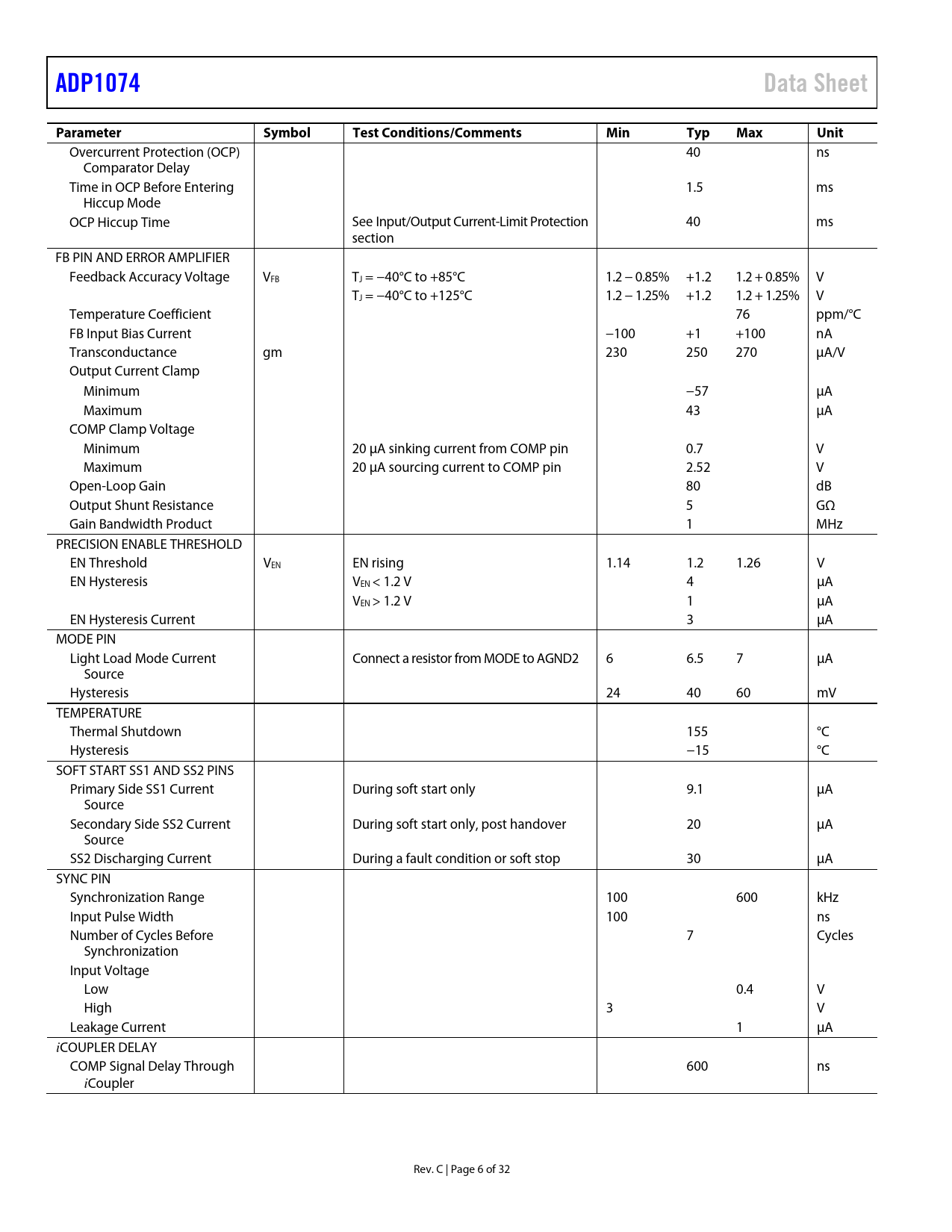 link to page 20 ADP1074Data SheetParameterSymbolTest Conditions/CommentsMinTypMaxUnit Overcurrent Protection (OCP) 40 ns Comparator Delay Time in OCP Before Entering 1.5 ms Hiccup Mode OCP Hiccup Time See Input/Output Current-Limit Protection 40 ms section FB PIN AND ERROR AMPLIFIER Feedback Accuracy Voltage VFB TJ = −40°C to +85°C 1.2 − 0.85% +1.2 1.2 + 0.85% V TJ = −40°C to +125°C 1.2 − 1.25% +1.2 1.2 + 1.25% V Temperature Coefficient 76 ppm/°C FB Input Bias Current −100 +1 +100 nA Transconductance gm 230 250 270 µA/V Output Current Clamp Minimum −57 µA Maximum 43 µA COMP Clamp Voltage Minimum 20 μA sinking current from COMP pin 0.7 V Maximum 20 μA sourcing current to COMP pin 2.52 V Open-Loop Gain 80 dB Output Shunt Resistance 5 GΩ Gain Bandwidth Product 1 MHz PRECISION ENABLE THRESHOLD EN Threshold VEN EN rising 1.14 1.2 1.26 V EN Hysteresis VEN < 1.2 V 4 µA VEN > 1.2 V 1 µA EN Hysteresis Current 3 µA MODE PIN Light Load Mode Current Connect a resistor from MODE to AGND2 6 6.5 7 µA Source Hysteresis 24 40 60 mV TEMPERATURE Thermal Shutdown 155 °C Hysteresis −15 °C SOFT START SS1 AND SS2 PINS Primary Side SS1 Current During soft start only 9.1 µA Source Secondary Side SS2 Current During soft start only, post handover 20 µA Source SS2 Discharging Current During a fault condition or soft stop 30 µA SYNC PIN Synchronization Range 100 600 kHz Input Pulse Width 100 ns Number of Cycles Before 7 Cycles Synchronization Input Voltage Low 0.4 V High 3 V Leakage Current 1 μA iCOUPLER DELAY COMP Signal Delay Through 600 ns iCoupler Rev. C | Page 6 of 32 Document Outline FEATURES APPLICATIONS SIMPLIFIED BLOCK DIAGRAM TABLE OF CONTENTS REVISION HISTORY GENERAL DESCRIPTION SPECIFICATIONS INSULATION AND SAFETY RELATED SPECIFICATIONS REGULATORY INFORMATION DIN V VDE V 0884-10 (VDE V 0884-10) INSULATION CHARACTERISTICS DIN V VDE V 0884-10 (VDE V 0884-10) INSULATION CHARACTERISTICS ABSOLUTE MAXIMUM RATINGS THERMAL RESISTANCE ESD CAUTION PIN CONFIGURATIONS AND FUNCTION DESCRIPTIONS TYPICAL PERFORMANCE CHARACTERISTICS THEORY OF OPERATION DETAILED BLOCK DIAGRAM PRIMARY SIDE SUPPLY, INPUT VOLTAGE, AND LDO SECONDARY SIDE SUPPLY AND LDO PRECISION ENABLE SOFT START PROCEDURE OUTPUT VOLTAGE SENSING AND FEEDBACK LOOP COMPENSATION AND STEADY STATE OPERATION SLOPE COMPENSATION INPUT/OUTPUT CURRENT-LIMIT PROTECTION TEMPERATURE SENSING FREQUENCY SETTING (RT PIN) MAXIMUM DUTY CYCLE FREQUENCY SYNCHRONIZATION SYNCHRONOUS RECTIFIER (SR) DRIVERS OUTPUT OVERVOLTAGE PROTECTION (OVP) ACTIVE CLAMP (PGATE) LEADING EDGE BLANKING GATE DELAY AND SR DEAD TIME LIGHT LOAD MODE (LLM) AND SR PHASE IN EXTERNAL START-UP CIRCUIT SOFT STOP POWER GOOD OCP/FEEDBACK RECOVERY OUTPUT VOLTAGE TRACKING REMOTE SYSTEM RESET OCP COUNTER INSULATION LIFETIME LAYOUT GUIDELINES TYPICAL APPLICATION CIRCUITS OUTLINE DIMENSIONS ORDERING GUIDE NOTES
