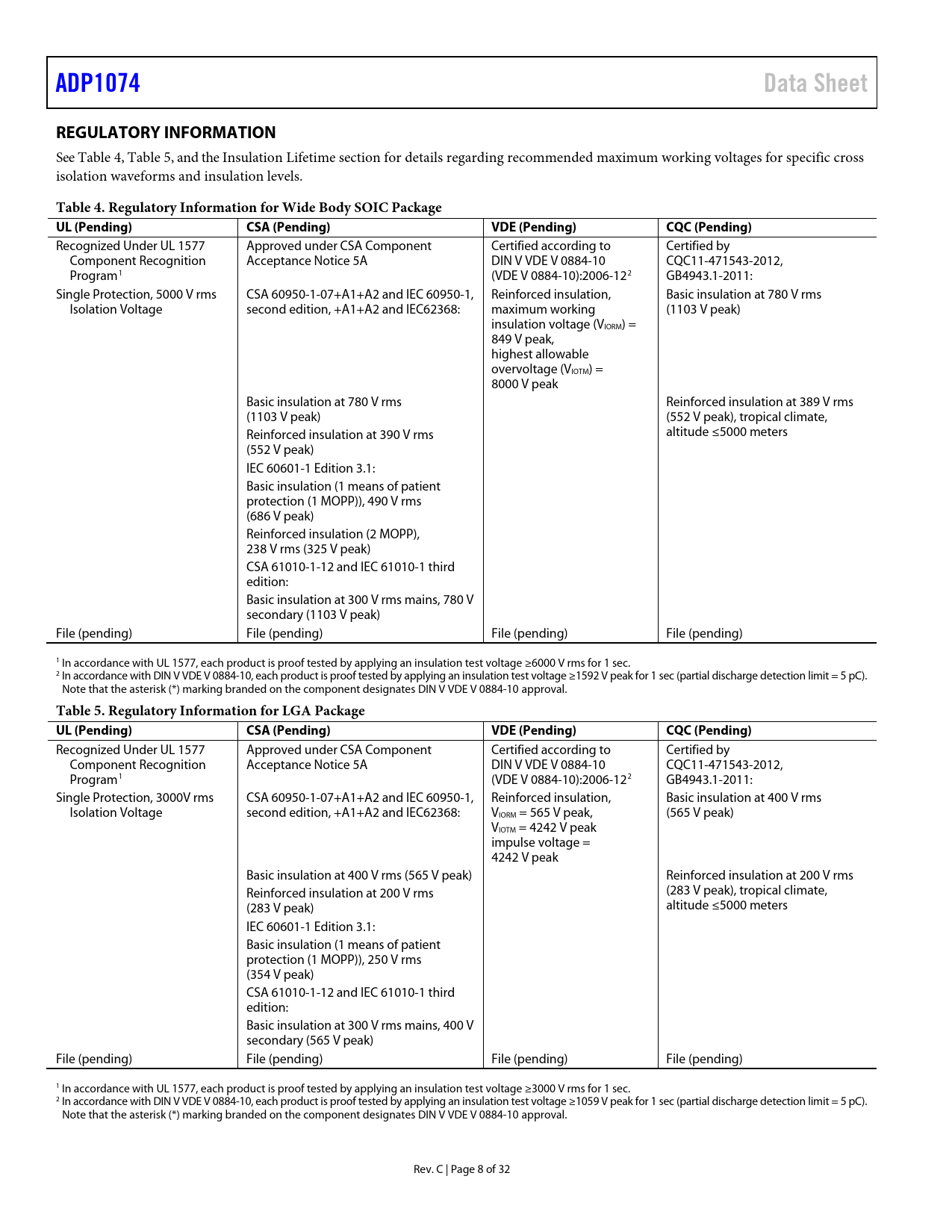 link to page 8 link to page 8 link to page 26 ADP1074Data SheetREGULATORY INFORMATION See Table 4, Table 5, and the Insulation Lifetime section for details regarding recommended maximum working voltages for specific cross isolation waveforms and insulation levels. Table 4. Regulatory Information for Wide Body SOIC Package UL (Pending)CSA (Pending)VDE (Pending)CQC (Pending) Recognized Under UL 1577 Approved under CSA Component Certified according to Certified by Component Recognition Acceptance Notice 5A DIN V VDE V 0884-10 CQC11-471543-2012, Program1 (VDE V 0884-10):2006-122 GB4943.1-2011: Single Protection, 5000 V rms CSA 60950-1-07+A1+A2 and IEC 60950-1, Reinforced insulation, Basic insulation at 780 V rms Isolation Voltage second edition, +A1+A2 and IEC62368: maximum working (1103 V peak) insulation voltage (VIORM) = 849 V peak, highest allowable overvoltage (VIOTM) = 8000 V peak Basic insulation at 780 V rms Reinforced insulation at 389 V rms (1103 V peak) (552 V peak), tropical climate, altitude ≤5000 meters Reinforced insulation at 390 V rms (552 V peak) IEC 60601-1 Edition 3.1: Basic insulation (1 means of patient protection (1 MOPP)), 490 V rms (686 V peak) Reinforced insulation (2 MOPP), 238 V rms (325 V peak) CSA 61010-1-12 and IEC 61010-1 third edition: Basic insulation at 300 V rms mains, 780 V secondary (1103 V peak) File (pending) File (pending) File (pending) File (pending) 1 In accordance with UL 1577, each product is proof tested by applying an insulation test voltage ≥6000 V rms for 1 sec. 2 In accordance with DIN V VDE V 0884-10, each product is proof tested by applying an insulation test voltage ≥1592 V peak for 1 sec (partial discharge detection limit = 5 pC). Note that the asterisk (*) marking branded on the component designates DIN V VDE V 0884-10 approval. Table 5. Regulatory Information for LGA Package UL (Pending)CSA (Pending)VDE (Pending)CQC (Pending) Recognized Under UL 1577 Approved under CSA Component Certified according to Certified by Component Recognition Acceptance Notice 5A DIN V VDE V 0884-10 CQC11-471543-2012, Program1 (VDE V 0884-10):2006-122 GB4943.1-2011: Single Protection, 3000V rms CSA 60950-1-07+A1+A2 and IEC 60950-1, Reinforced insulation, Basic insulation at 400 V rms Isolation Voltage second edition, +A1+A2 and IEC62368: VIORM = 565 V peak, (565 V peak) VIOTM = 4242 V peak impulse voltage = 4242 V peak Basic insulation at 400 V rms (565 V peak) Reinforced insulation at 200 V rms (283 V peak), tropical climate, Reinforced insulation at 200 V rms altitude ≤5000 meters (283 V peak) IEC 60601-1 Edition 3.1: Basic insulation (1 means of patient protection (1 MOPP)), 250 V rms (354 V peak) CSA 61010-1-12 and IEC 61010-1 third edition: Basic insulation at 300 V rms mains, 400 V secondary (565 V peak) File (pending) File (pending) File (pending) File (pending) 1 In accordance with UL 1577, each product is proof tested by applying an insulation test voltage ≥3000 V rms for 1 sec. 2 In accordance with DIN V VDE V 0884-10, each product is proof tested by applying an insulation test voltage ≥1059 V peak for 1 sec (partial discharge detection limit = 5 pC). Note that the asterisk (*) marking branded on the component designates DIN V VDE V 0884-10 approval. Rev. C | Page 8 of 32 Document Outline FEATURES APPLICATIONS SIMPLIFIED BLOCK DIAGRAM TABLE OF CONTENTS REVISION HISTORY GENERAL DESCRIPTION SPECIFICATIONS INSULATION AND SAFETY RELATED SPECIFICATIONS REGULATORY INFORMATION DIN V VDE V 0884-10 (VDE V 0884-10) INSULATION CHARACTERISTICS DIN V VDE V 0884-10 (VDE V 0884-10) INSULATION CHARACTERISTICS ABSOLUTE MAXIMUM RATINGS THERMAL RESISTANCE ESD CAUTION PIN CONFIGURATIONS AND FUNCTION DESCRIPTIONS TYPICAL PERFORMANCE CHARACTERISTICS THEORY OF OPERATION DETAILED BLOCK DIAGRAM PRIMARY SIDE SUPPLY, INPUT VOLTAGE, AND LDO SECONDARY SIDE SUPPLY AND LDO PRECISION ENABLE SOFT START PROCEDURE OUTPUT VOLTAGE SENSING AND FEEDBACK LOOP COMPENSATION AND STEADY STATE OPERATION SLOPE COMPENSATION INPUT/OUTPUT CURRENT-LIMIT PROTECTION TEMPERATURE SENSING FREQUENCY SETTING (RT PIN) MAXIMUM DUTY CYCLE FREQUENCY SYNCHRONIZATION SYNCHRONOUS RECTIFIER (SR) DRIVERS OUTPUT OVERVOLTAGE PROTECTION (OVP) ACTIVE CLAMP (PGATE) LEADING EDGE BLANKING GATE DELAY AND SR DEAD TIME LIGHT LOAD MODE (LLM) AND SR PHASE IN EXTERNAL START-UP CIRCUIT SOFT STOP POWER GOOD OCP/FEEDBACK RECOVERY OUTPUT VOLTAGE TRACKING REMOTE SYSTEM RESET OCP COUNTER INSULATION LIFETIME LAYOUT GUIDELINES TYPICAL APPLICATION CIRCUITS OUTLINE DIMENSIONS ORDERING GUIDE NOTES