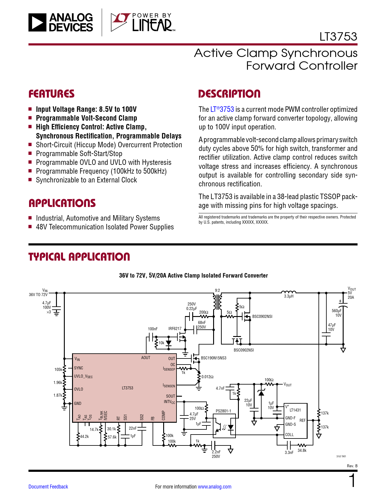 LT3753 Active Clamp Synchronous Forward Controller FEATURESDESCRIPTION n Input Voltage Range: 8.5V to 100V The LT®3753 is a current mode PWM controller optimized n Programmable Volt-Second Clamp for an active clamp forward converter topology, allowing n High Efficiency Control: Active Clamp, up to 100V input operation. Synchronous Rectification, Programmable Delays A programmable volt-second clamp allows primary switch n Short-Circuit (Hiccup Mode) Overcurrent Protection duty cycles above 50% for high switch, transformer and n Programmable Soft-Start/Stop rectifier utilization. Active clamp control reduces switch n Programmable OVLO and UVLO with Hysteresis voltage stress and increases efficiency. A synchronous n Programmable Frequency (100kHz to 500kHz) output is available for controlling secondary side syn- n Synchronizable to an External Clock chronous rectification. The LT3753 is available in a 38-lead plastic TSSOP pack- APPLICATIONS age with missing pins for high voltage spacings. n Industrial, Automotive and Military Systems All registered trademarks and trademarks are the property of their respective owners. Protected by U.S. patents, including XXXXX, XXXXX. n 48V Telecommunication Isolated Power Supplies TYPICAL APPLICATION36V to 72V, 5V/20A Active Clamp Isolated Forward Converter VOUT VIN 9:2 5V 36V TO 72V 3.3µH • • 20A + 4.7µF 250V 100V 0.22µF 5Ω 560µF ×3 200Ω 5Ω 10V BSC0902NSI 68nF 47µF 100nF IRF6217 250V 10V 10k BSC0902NSI VIN AOUT OUT BSC190N15NS3 OC SYNC I 105k SENSEP 1k UVLO_VSEC 0.012Ω 100Ω 1.96k I V SENSEN OUT LT3753 OVLO 4.7nF 1.87k 1k SOUT 22µF INTVCC GND 1µF 10V V+ 100Ω 10V PS2801-1 LT1431 4.7µF 137k T AO T AS T OS T BLNK IVSEC RT SS1 SS2 FB COMP 25V GND-F REF 1µF GND-S 14.7k 30.1k 22nF 137k 44.2k 57.6k 1µF 100k COLL 100k 1k 2.2nF 3.3nF 34.8k 250V 3753 TA01 Rev. B Document Feedback For more information www.analog.com 1 Document Outline Features Applications Typical Application Description Table of Contents Absolute Maximum Ratings Order Information Pin Configuration Electrical Characteristics Typical Performance Characteristics Pin Functions Block Diagram Timing Diagrams Operation Applications Information Package Description Revision History Typical Application Related Parts
