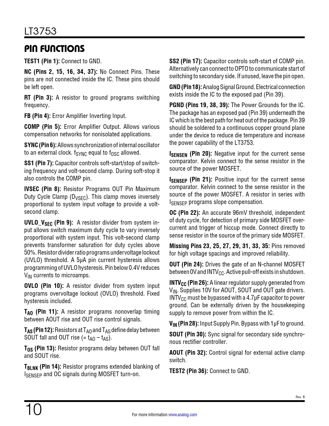 LT3753 PIN FUNCTIONS TEST1 (Pin 1): Connect to GND. SS2 (Pin 17): Capacitor controls soft-start of COMP pin. NC (Pins 2, 15, 16, 34, 37): No Connect Pins. These Alternatively can connect to OPTO to communicate start of pins are not connected inside the IC. These pins should switching to secondary side. If unused, leave the pin open. be left open. GND (Pin 18): Analog Signal Ground. Electrical connection RT (Pin 3): A resistor to ground programs switching exists inside the IC to the exposed pad (Pin 39). frequency. PGND (Pins 19, 38, 39): The Power Grounds for the IC. FB (Pin 4): Error Amplifier Inverting Input. The package has an exposed pad (Pin 39) underneath the IC which is the best path for heat out of the package. Pin 39 COMP (Pin 5): Error Amplifier Output. Allows various should be soldered to a continuous copper ground plane compensation networks for nonisolated applications. under the device to reduce die temperature and increase SYNC (Pin 6): Allows synchronization of internal oscillator the power capability of the LT3753. to an external clock. fSYNC equal to fOSC allowed. ISENSEN (Pin 20): Negative input for the current sense SS1 (Pin 7): Capacitor controls soft-start/stop of switch- comparator. Kelvin connect to the sense resistor in the ing frequency and volt-second clamp. During soft-stop it source of the power MOSFET. also controls the COMP pin. ISENSEP (Pin 21): Positive input for the current sense IVSEC (Pin 8): Resistor Programs OUT Pin Maximum comparator. Kelvin connect to the sense resistor in the Duty Cycle Clamp (D source of the power MOSFET. A resistor in series with VSEC). This clamp moves inversely proportional to system input voltage to provide a volt- ISENSEP programs slope compensation. second clamp. OC (Pin 22): An accurate 96mV threshold, independent UVLO_V of duty cycle, for detection of primary side MOSFET over- SEC (Pin 9): A resistor divider from system in- put allows switch maximum duty cycle to vary inversely current and trigger of hiccup mode. Connect directly to proportional with system input. This volt-second clamp sense resistor in the source of the primary side MOSFET. prevents transformer saturation for duty cycles above Missing Pins 23, 25, 27, 29, 31, 33, 35: Pins removed 50%. Resistor divider ratio programs undervoltage lockout for high voltage spacings and improved reliability. (UVLO) threshold. A 5µA pin current hysteresis allows programming of UVLO hysteresis. Pin below 0.4V reduces OUT (Pin 24): Drives the gate of an N-channel MOSFET V between 0V and INTVCC. Active pull-off exists in shutdown. IN currents to microamps. OVLO (Pin 10): A resistor divider from system input INTVCC (Pin 26): A linear regulator supply generated from programs overvoltage lockout (OVLO) threshold. Fixed VIN. Supplies 10V for AOUT, SOUT and OUT gate drivers. hysteresis included. INTVCC must be bypassed with a 4.7µF capacitor to power ground. Can be externally driven by the housekeeping TAO (Pin 11): A resistor programs nonoverlap timing supply to remove power from within the IC. between AOUT rise and OUT rise control signals. VIN (Pin 28): Input Supply Pin. Bypass with 1µF to ground. TAS (Pin 12): Resistors at TAO and TAS define delay between SOUT fall and OUT rise (= t SOUT (Pin 30): Sync signal for secondary side synchro- AO – tAS). nous rectifier controller. TOS (Pin 13): Resistor programs delay between OUT fall and SOUT rise. AOUT (Pin 32): Control signal for external active clamp switch. TBLNK (Pin 14): Resistor programs extended blanking of I TEST2 (Pin 36): Connect to GND. SENSEP and OC signals during MOSFET turn-on. Rev. B 10 For more information www.analog.com Document Outline Features Applications Typical Application Description Table of Contents Absolute Maximum Ratings Order Information Pin Configuration Electrical Characteristics Typical Performance Characteristics Pin Functions Block Diagram Timing Diagrams Operation Applications Information Package Description Revision History Typical Application Related Parts
