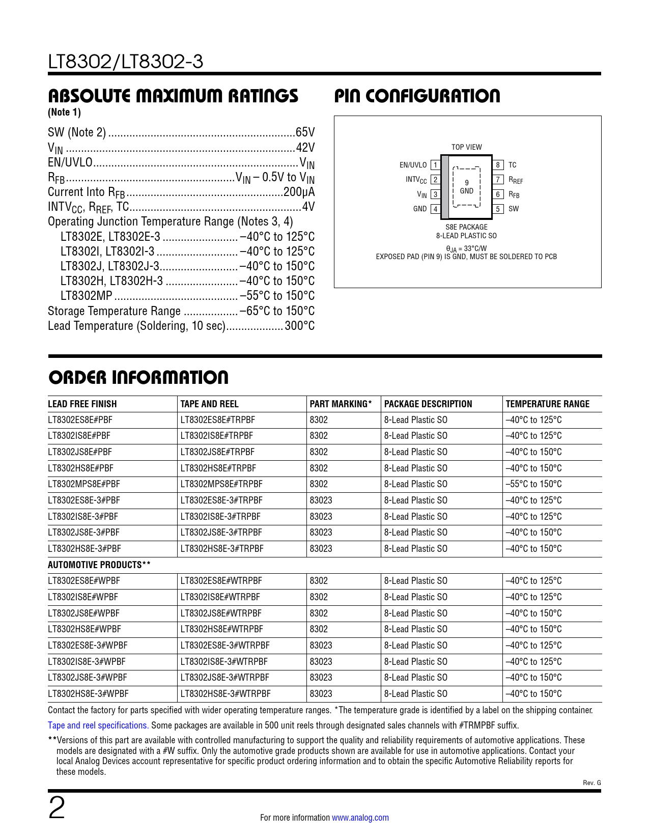 LT8302ES8E#WPBF LT8302ES8E#WTRPBF 8302 8-Lead Plastic SO –40°C to 125°C LT8302IS8E#WPBF LT8302IS8E#WTRPBF 8302 8-Lead Plastic SO –40°C to 125°C LT8302JS8E#WPBF LT8302JS8E#WTRPBF 8302 8-Lead Plastic SO –40°C to 150°C LT8302HS8E#WPBF LT8302HS8E#WTRPBF 8302 8-Lead Plastic SO –40°C to 150°C LT8302ES8E-3#WPBF LT8302ES8E-3#WTRPBF 83023 8-Lead Plastic SO –40°C to 125°C LT8302IS8E-3#WPBF LT8302IS8E-3#WTRPBF 83023 8-Lead Plastic SO –40°C to 125°C LT8302JS8E-3#WPBF LT8302JS8E-3#WTRPBF 83023 8-Lead Plastic SO –40°C to 150°C LT8302HS8E-3#WPBF LT8302HS8E-3#WTRPBF 83023 8-Lead Plastic SO –40°C to 150°C Contact the factory for parts specified with wider operating temperature ranges. *The temperature grade is identified by a label on the shipping container. Tape and reel specifications. Some packages are available in 500 unit reels through designated sales channels with #TRMPBF suffix.