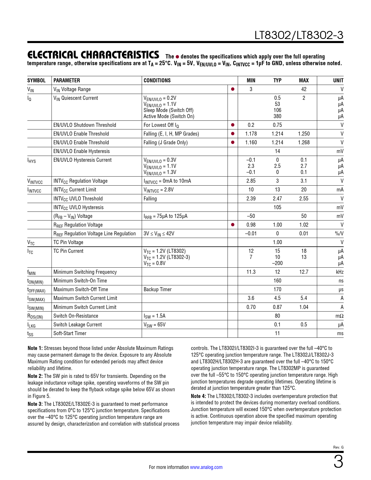 VIN VIN Voltage Range l 3 42 V IQ VIN Quiescent Current VEN/UVLO = 0.2V 0.5 2 µA VEN/UVLO = 1.1V 53 µA Sleep Mode (Switch Off) 106 µA Active Mode (Switch On) 380 µA EN/UVLO Shutdown Threshold For Lowest Off IQ l 0.2 0.75 V EN/UVLO Enable Threshold Falling (E, I, H, MP Grades) l 1.178 1.214 1.250 V EN/UVLO Enable Threshold Falling (J Grade Only) l 1.160 1.214 1.268 V EN/UVLO Enable Hysteresis 14 mV IHYS EN/UVLO Hysteresis Current VEN/UVLO = 0.3V –0.1 0 0.1 µA VEN/UVLO = 1.1V 2.3 2.5 2.7 µA VEN/UVLO = 1.3V –0.1 0 0.1 µA VINTVCC INTVCC Regulation Voltage IINTVCC = 0mA to 10mA 2.85 3 3.1 V IINTVCC INTVCC Current Limit VINTVCC = 2.8V 10 13 20 mA INTVCC UVLO Threshold Falling 2.39 2.47 2.55 V INTVCC UVLO Hysteresis 105 mV (RFB – VIN) Voltage IRFB = 75µA to 125µA –50 50 mV RREF Regulation Voltage l 0.98 1.00 1.02 V RREF Regulation Voltage Line Regulation 3V ≤ VIN ≤ 42V –0.01 0 0.01 %/V VTC TC Pin Voltage 1.00 V ITC TC Pin Current VTC = 1.2V (LT8302) 12 15 18 µA VTC = 1.2V (LT8302-3) 7 10 13 µA VTC = 0.8V –200 µA fMIN Minimum Switching Frequency 11.3 12 12.7 kHz tON(MIN) Minimum Switch-On Time 160 ns tOFF(MAX) Maximum Switch-Off Time Backup Timer 170 µs ISW(MAX) Maximum Switch Current Limit 3.6 4.5 5.4 A ISW(MIN) Minimum Switch Current Limit 0.70 0.87 1.04 A RDS(ON) Switch On-Resistance ISW = 1.5A 80 mΩ ILKG Switch Leakage Current VSW = 65V 0.1 0.5 µA tSS Soft-Start Timer 11 ms
