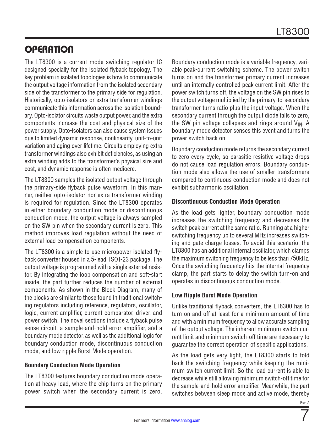 link to page 6 LT8300 OPERATION The LT8300 is a current mode switching regulator IC Boundary conduction mode is a variable frequency, vari- designed special y for the isolated flyback topology. The able peak-current switching scheme. The power switch key problem in isolated topologies is how to communicate turns on and the transformer primary current increases the output voltage information from the isolated secondary until an internally controlled peak current limit. After the side of the transformer to the primary side for regulation. power switch turns off, the voltage on the SW pin rises to Historically, opto-isolators or extra transformer windings the output voltage multiplied by the primary-to-secondary communicate this information across the isolation bound- transformer turns ratio plus the input voltage. When the ary. Opto-isolator circuits waste output power, and the extra secondary current through the output diode falls to zero, components increase the cost and physical size of the the SW pin voltage collapses and rings around VIN. A power supply. Opto-isolators can also cause system issues boundary mode detector senses this event and turns the due to limited dynamic response, nonlinearity, unit-to-unit power switch back on. variation and aging over lifetime. Circuits employing extra Boundary conduction mode returns the secondary current transformer windings also exhibit deficiencies, as using an to zero every cycle, so parasitic resistive voltage drops extra winding adds to the transformer’s physical size and do not cause load regulation errors. Boundary conduc- cost, and dynamic response is often mediocre. tion mode also allows the use of smaller transformers The LT8300 samples the isolated output voltage through compared to continuous conduction mode and does not the primary-side flyback pulse waveform. In this man- exhibit subharmonic oscillation. ner, neither opto-isolator nor extra transformer winding is required for regulation. Since the LT8300 operates Discontinuous Conduction Mode Operation in either boundary conduction mode or discontinuous As the load gets lighter, boundary conduction mode conduction mode, the output voltage is always sampled increases the switching frequency and decreases the on the SW pin when the secondary current is zero. This switch peak current at the same ratio. Running at a higher method improves load regulation without the need of switching frequency up to several MHz increases switch- external load compensation components. ing and gate charge losses. To avoid this scenario, the The LT8300 is a simple to use micropower isolated fly- LT8300 has an additional internal oscillator, which clamps back converter housed in a 5-lead TSOT-23 package. The the maximum switching frequency to be less than 750kHz. output voltage is programmed with a single external resis- Once the switching frequency hits the internal frequency tor. By integrating the loop compensation and soft-start clamp, the part starts to delay the switch turn-on and inside, the part further reduces the number of external operates in discontinuous conduction mode. components. As shown in the Block Diagram, many of the blocks are similar to those found in traditional switch- Low Ripple Burst Mode Operation ing regulators including reference, regulators, oscillator, Unlike traditional flyback converters, the LT8300 has to logic, current amplifier, current comparator, driver, and turn on and off at least for a minimum amount of time power switch. The novel sections include a flyback pulse and with a minimum frequency to allow accurate sampling sense circuit, a sample-and-hold error amplifier, and a of the output voltage. The inherent minimum switch cur- boundary mode detector, as wel as the additional logic for rent limit and minimum switch-off time are necessary to boundary conduction mode, discontinuous conduction guarantee the correct operation of specific applications. mode, and low ripple Burst Mode operation. As the load gets very light, the LT8300 starts to fold Boundary Conduction Mode Operation back the switching frequency while keeping the mini- mum switch current limit. So the load current is able to The LT8300 features boundary conduction mode opera- decrease while still allowing minimum switch-off time for tion at heavy load, where the chip turns on the primary the sample-and-hold error amplifier. Meanwhile, the part power switch when the secondary current is zero. switches between sleep mode and active mode, thereby Rev. A For more information www.analog.com 7 Document Outline Features Applications Typical Application Description Absolute Maximum Ratings Order Information Pin Configuration Electrical Characteristics Typical Performance Characteristics Pin Functions Operation Applications Information Typical Applications Package Description Typical Application Related Parts