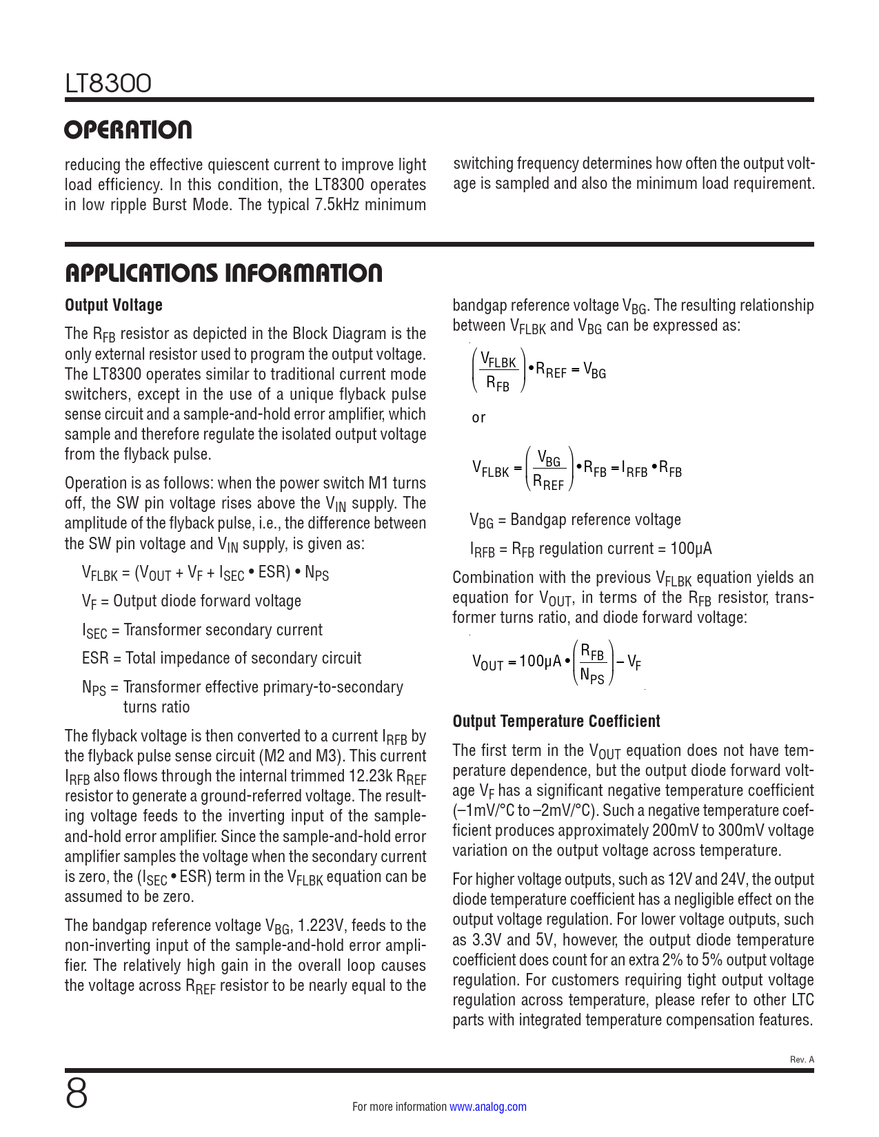 link to page 6 link to page 7 LT8300 OPERATION reducing the effective quiescent current to improve light switching frequency determines how often the output volt- load efficiency. In this condition, the LT8300 operates age is sampled and also the minimum load requirement. in low ripple Burst Mode. The typical 7.5kHz minimum APPLICATIONS INFORMATION Output Voltage bandgap reference voltage VBG. The resulting relationship The R between VFLBK and VBG can be expressed as: FB resistor as depicted in the Block Diagram is the only external resistor used to program the output voltage. ⎛ V ⎞ The LT8300 operates similar to traditional current mode FLBK ⎜ ⎟ •RREF = VBG ⎝ R switchers, except in the use of a unique flyback pulse FB ⎠ sense circuit and a sample-and-hold error amplifier, which or sample and therefore regulate the isolated output voltage from the flyback pulse. ⎛ V ⎞ V BG ⎜ ⎟ •R Operation is as follows: when the power switch M1 turns FLBK = FB = IRFB • RFB ⎝RREF ⎠ off, the SW pin voltage rises above the VIN supply. The amplitude of the flyback pulse, i.e., the difference between VBG = Bandgap reference voltage the SW pin voltage and VIN supply, is given as: IRFB = RFB regulation current = 100µA VFLBK = (VOUT + VF + ISEC • ESR) • NPS Combination with the previous VFLBK equation yields an VF = Output diode forward voltage equation for VOUT, in terms of the RFB resistor, trans- former turns ratio, and diode forward voltage: ISEC = Transformer secondary current ESR = Total impedance of secondary circuit ⎛ R ⎞ V FB OUT = 100µA • ⎜ ⎟− VF ⎝N N PS ⎠ PS = Transformer effective primary-to-secondary turns ratio Output Temperature Coefficient The flyback voltage is then converted to a current IRFB by the flyback pulse sense circuit (M2 and M3). This current The first term in the VOUT equation does not have tem- I perature dependence, but the output diode forward volt- RFB also flows through the internal trimmed 12.23k RREF resistor to generate a ground-referred voltage. The result- age VF has a significant negative temperature coefficient ing voltage feeds to the inverting input of the sample- (–1mV/°C to –2mV/°C). Such a negative temperature coef- and-hold error amplifier. Since the sample-and-hold error ficient produces approximately 200mV to 300mV voltage amplifier samples the voltage when the secondary current variation on the output voltage across temperature. is zero, the (ISEC • ESR) term in the VFLBK equation can be For higher voltage outputs, such as 12V and 24V, the output assumed to be zero. diode temperature coefficient has a negligible effect on the The bandgap reference voltage V output voltage regulation. For lower voltage outputs, such BG, 1.223V, feeds to the non-inverting input of the sample-and-hold error ampli- as 3.3V and 5V, however, the output diode temperature fier. The relatively high gain in the overall loop causes coefficient does count for an extra 2% to 5% output voltage the voltage across R regulation. For customers requiring tight output voltage REF resistor to be nearly equal to the regulation across temperature, please refer to other LTC parts with integrated temperature compensation features. Rev. A 8 For more information www.analog.com Document Outline Features Applications Typical Application Description Absolute Maximum Ratings Order Information Pin Configuration Electrical Characteristics Typical Performance Characteristics Pin Functions Operation Applications Information Typical Applications Package Description Typical Application Related Parts