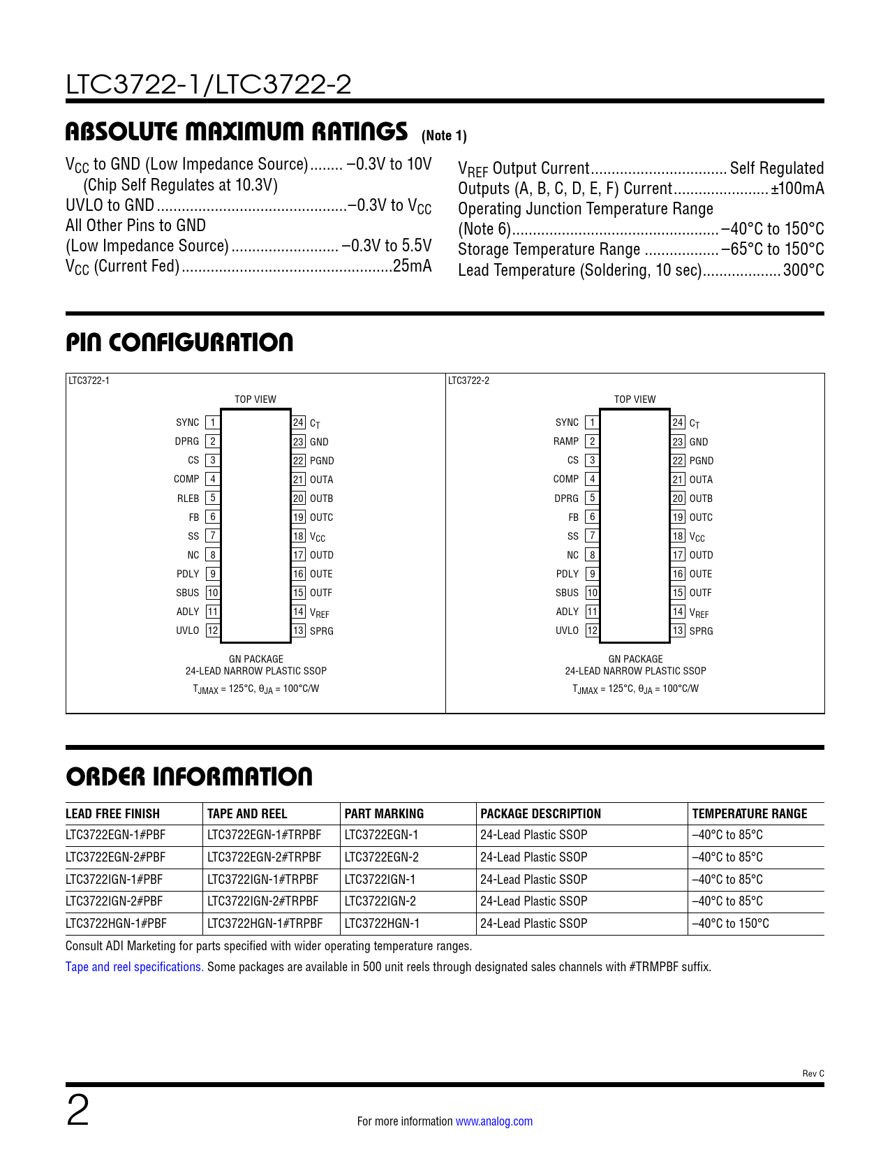 LTC3722EGN-1#PBF LTC3722EGN-1#TRPBF LTC3722EGN-1 24-Lead Plastic SSOP –40°C to 85°C LTC3722EGN-2#PBF LTC3722EGN-2#TRPBF LTC3722EGN-2 24-Lead Plastic SSOP –40°C to 85°C LTC3722IGN-1#PBF LTC3722IGN-1#TRPBF LTC3722IGN-1 24-Lead Plastic SSOP –40°C to 85°C LTC3722IGN-2#PBF LTC3722IGN-2#TRPBF LTC3722IGN-2 24-Lead Plastic SSOP –40°C to 85°C LTC3722HGN-1#PBF LTC3722HGN-1#TRPBF LTC3722HGN-1 24-Lead Plastic SSOP –40°C to 150°C Consult ADI Marketing for parts specified with wider operating temperature ranges. Tape and reel specifications. Some packages are available in 500 unit reels through designated sales channels with #TRMPBF suffix. Rev C 2 For more information www.analog.com Document Outline Features Applications Description Typical Application Absolute Maximum Ratings Pin Configuration Order Information Electrical Characteristics Typical Performance Characteristics Pin Functions Block Diagram Timing Diagram Operation Revision History Typical application Related Parts