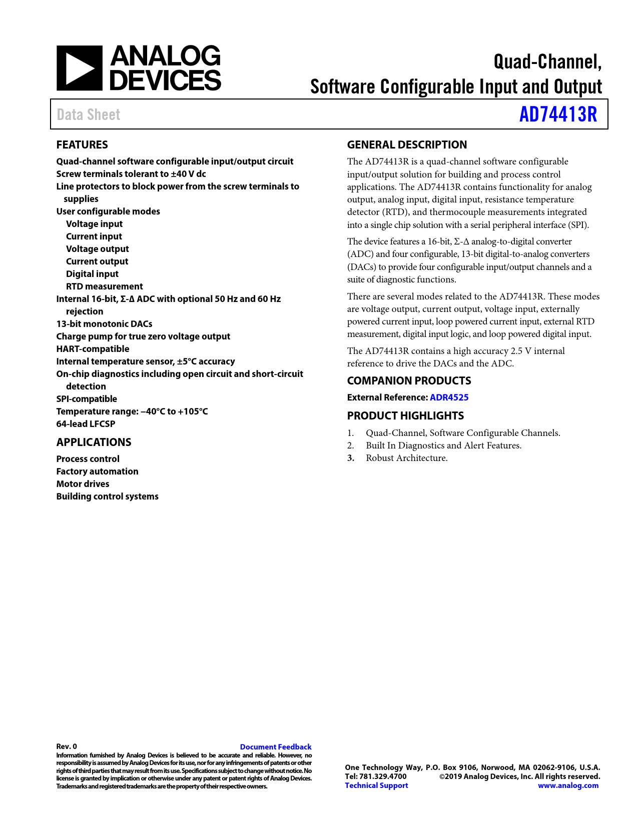 Factory automation Motor drives Building control systems Rev. 0 Document Feedback Information furnished by Analog Devices is believed to be accurate and reliable. However, no responsibility is assumed by Analog Devices for its use, nor for any infringements of patents or other rights of third parties that may result from its use. Specifications subject to change without notice. No One Technology Way, P.O. Box 9106, Norwood, MA 02062-9106, U.S.A. license is granted by implication or otherwise under any patent or patent rights of Analog Devices. Tel: 781.329.4700 ©2019 Analog Devices, Inc. All rights reserved. Trademarks and registered trademarks are the property of their respective owners. Technical Support www.analog.com