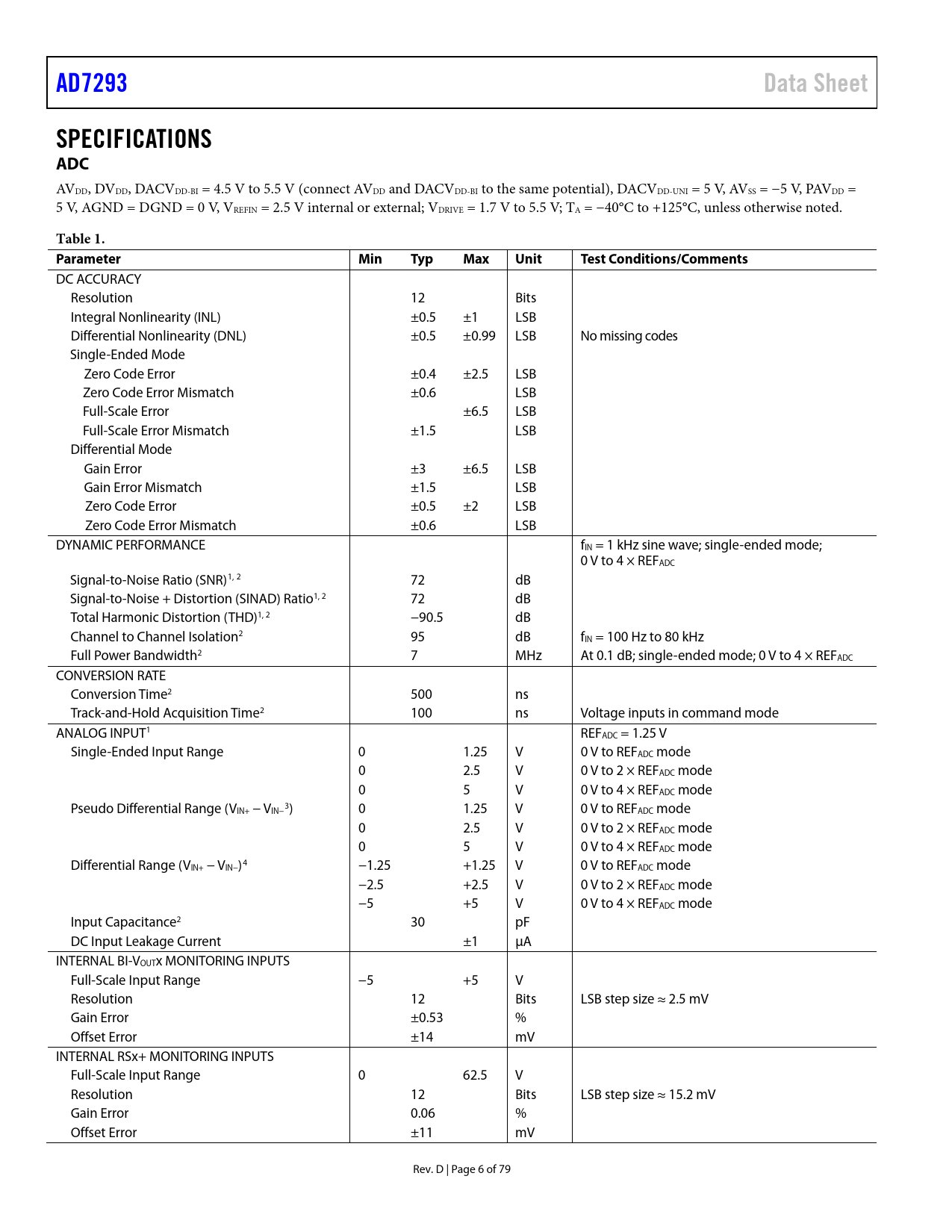页数 / 页79 / 6 — AD7293. Data Sheet. SPECIFICATIONS ADC. Table 1. Parameter. Min. Typ. …