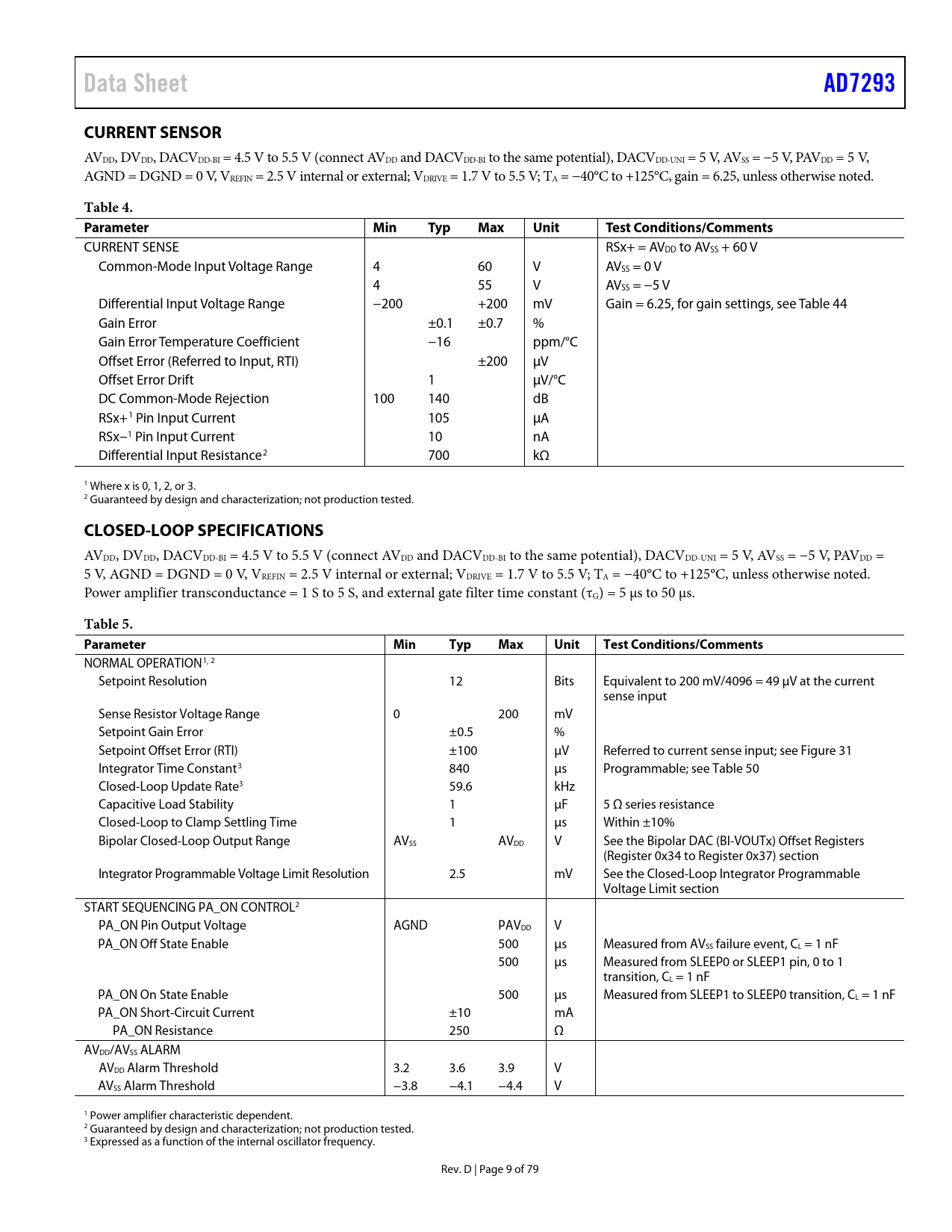 页数 / 页79 / 9 — Data Sheet. AD7293. CURRENT SENSOR. Table 4. Parameter. Min. Typ. Max. …