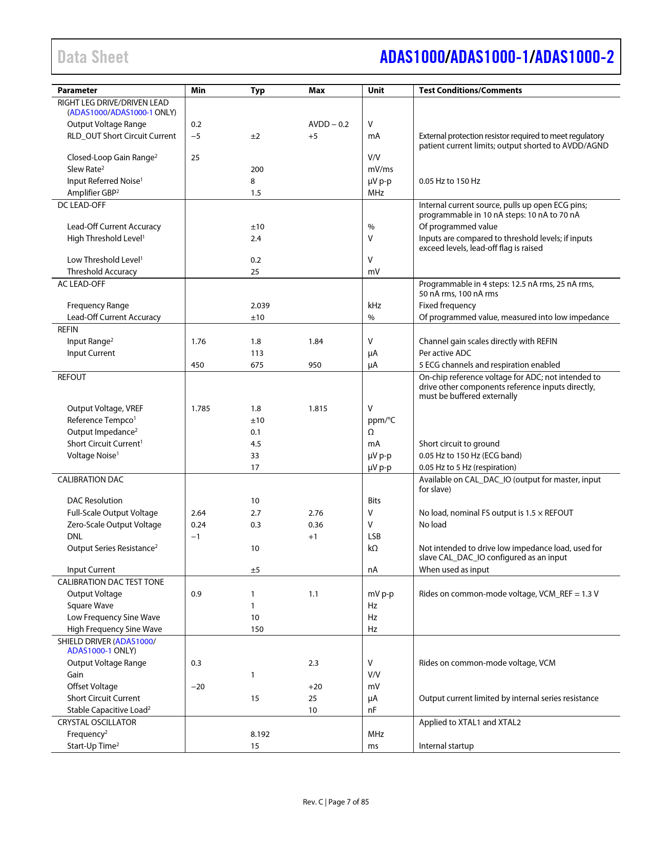 link to page 9 link to page 9 link to page 9 link to page 9 link to page 9 link to page 9 link to page 9 link to page 9 Data SheetADAS1000/ADAS1000-1/ADAS1000-2ParameterMinTypMaxUnitTest Conditions/Comments RIGHT LEG DRIVE/DRIVEN LEAD (ADAS1000/ADAS1000-1 ONLY) Output Voltage Range 0.2 AVDD − 0.2 V RLD_OUT Short Circuit Current −5 ±2 +5 mA External protection resistor required to meet regulatory patient current limits; output shorted to AVDD/AGND Closed-Loop Gain Range2 25 V/V Slew Rate2 200 mV/ms Input Referred Noise1 8 μV p-p 0.05 Hz to 150 Hz Amplifier GBP2 1.5 MHz DC LEAD-OFF Internal current source, pulls up open ECG pins; programmable in 10 nA steps: 10 nA to 70 nA Lead-Off Current Accuracy ±10 % Of programmed value High Threshold Level1 2.4 V Inputs are compared to threshold levels; if inputs exceed levels, lead-off flag is raised Low Threshold Level1 0.2 V Threshold Accuracy 25 mV AC LEAD-OFF Programmable in 4 steps: 12.5 nA rms, 25 nA rms, 50 nA rms, 100 nA rms Frequency Range 2.039 kHz Fixed frequency Lead-Off Current Accuracy ±10 % Of programmed value, measured into low impedance REFIN Input Range2 1.76 1.8 1.84 V Channel gain scales directly with REFIN Input Current 113 μA Per active ADC 450 675 950 μA 5 ECG channels and respiration enabled REFOUT On-chip reference voltage for ADC; not intended to drive other components reference inputs directly, must be buffered externally Output Voltage, VREF 1.785 1.8 1.815 V Reference Tempco1 ±10 ppm/°C Output Impedance2 0.1 Ω Short Circuit Current1 4.5 mA Short circuit to ground Voltage Noise1 33 μV p-p 0.05 Hz to 150 Hz (ECG band) 17 μV p-p 0.05 Hz to 5 Hz (respiration) CALIBRATION DAC Available on CAL_DAC_IO (output for master, input for slave) DAC Resolution 10 Bits Full-Scale Output Voltage 2.64 2.7 2.76 V No load, nominal FS output is 1.5 × REFOUT Zero-Scale Output Voltage 0.24 0.3 0.36 V No load DNL −1 +1 LSB Output Series Resistance2 10 kΩ Not intended to drive low impedance load, used for slave CAL_DAC_IO configured as an input Input Current ±5 nA When used as input CALIBRATION DAC TEST TONE Output Voltage 0.9 1 1.1 mV p-p Rides on common-mode voltage, VCM_REF = 1.3 V Square Wave 1 Hz Low Frequency Sine Wave 10 Hz High Frequency Sine Wave 150 Hz SHIELD DRIVER (ADAS1000/ ADAS1000-1 ONLY) Output Voltage Range 0.3 2.3 V Rides on common-mode voltage, VCM Gain 1 V/V Offset Voltage −20 +20 mV Short Circuit Current 15 25 μA Output current limited by internal series resistance Stable Capacitive Load2 10 nF CRYSTAL OSCILLATOR Applied to XTAL1 and XTAL2 Frequency2 8.192 MHz Start-Up Time2 15 ms Internal startup Rev. C | Page 7 of 85 Document Outline Features Applications General Description Revision History Functional Block Diagram Specifications Noise Performance Timing Characteristics Standard Serial Interface Secondary Serial Interface (Master Interface for Customer-Based Digital Pace Algorithm) ADAS1000/ADAS1000-1 Only Absolute Maximum Ratings Thermal Resistance ESD Caution Pin Configurations and Function Descriptions Typical Performance Characteristics Applications Information Overview ECG Inputs—Electrodes/Leads ECG Channel Electrode/Lead Formation and Input Stage Configuration Analog Lead Mode and Calculation Digital Lead Mode and Calculation Electrode Mode: Single-Ended Input Electrode Configuration Electrode Mode: Common Electrode A and Electrode B Configurations Defibrillator Protection ESIS Filtering ECG Path Input Multiplexing Common-Mode Selection and Averaging Wilson Central Terminal (WCT) Right Leg Drive/Reference Drive Calibration DAC Gain Calibration Lead-Off Detection DC Lead-Off Detection DC Lead-Off and High Gains DC Lead-Off Debounce Timer AC Lead-Off Detection ACLO and Common-Mode Configuration ADC Out of Range Shield Driver Respiration (ADAS1000 Model Only) Internal Respiration Capacitors External Respiration Path External Respiration Capacitors Respiration Carrier Frequency Evaluating Respiration Performance Extend Switch On Respiration Paths Pacing Artifact Detection Function (ADAS1000 Only) Choice of Leads Detection Algorithm Overview Pace Edge Threshold Pace Level Threshold Pace Amplitude Threshold Pace Validation Filters Pace Width Filter Biventricular Pacers Pace Detection Measurements Evaluating Pace Detection Performance Pace Width Pace Latency Pace Detection via Secondary Serial Interface (ADAS1000 and ADAS1000-1 Only) Filtering Voltage Reference Gang Mode Operation Master/Slave Synchronizing Devices Calibration Common Mode Right Leg Drive Sequencing Devices into Gang Mode Number of Devices in Gang Mode Interfacing in Gang Mode Serial Interfaces Standard Serial Interface Write Mode Write/Read Data Format Data Frames/Packets Read Mode Serial Clock Rate Data Rate and Skip Mode Data Ready (DRDYB) Detecting Missed Conversion Data SPI Interface Resync CRC Word Clocks Secondary Serial Interface RESETB PDB Function SPI Output Frame Structure (ECG and Status Data) SPI Register Definitions and Memory Map Control Registers Details Examples of Interfacing to the ADAS1000 Example 1: Initialize the ADAS1000 for ECG Capture and Start Streaming Data Example 2: Enable Respiration and Stream Conversion Data Example 3: DC Lead-Off and Stream Conversion Data Example 4: Configure 150 Hz Test Tone Sine Wave on Each ECG Channel and Stream Conversion Data Example 5: Enable Pace Detection and Stream Conversion Data Example 6: Writing to Master and Slave Devices and Streaming Conversion Data Slave Configuration Master Configuration Software Flowchart Power Supply, Grounding, and Decoupling Strategy AVDD ADCVDD and DVDD Supplies Unused Pins/Paths Layout Recommendations Outline Dimensions Ordering Guide