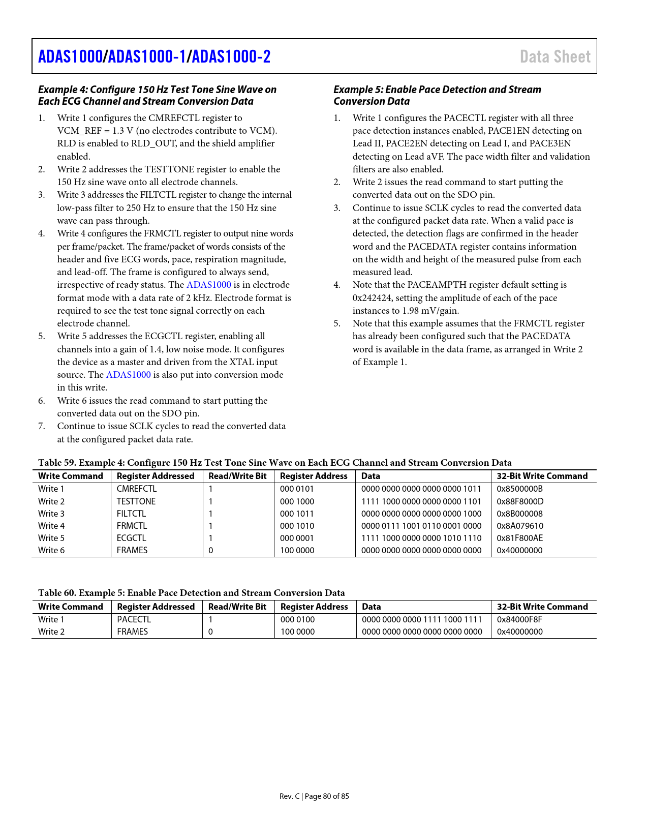 ADAS1000/ ADAS1000-1 /ADAS1000-2 Data Sheet Example 4: Configure 150 Hz Test Tone Sine Wave on Example 5: Enable Pace Detection and Stream Each ECG Channel and Stream Conversion Data Conversion Data