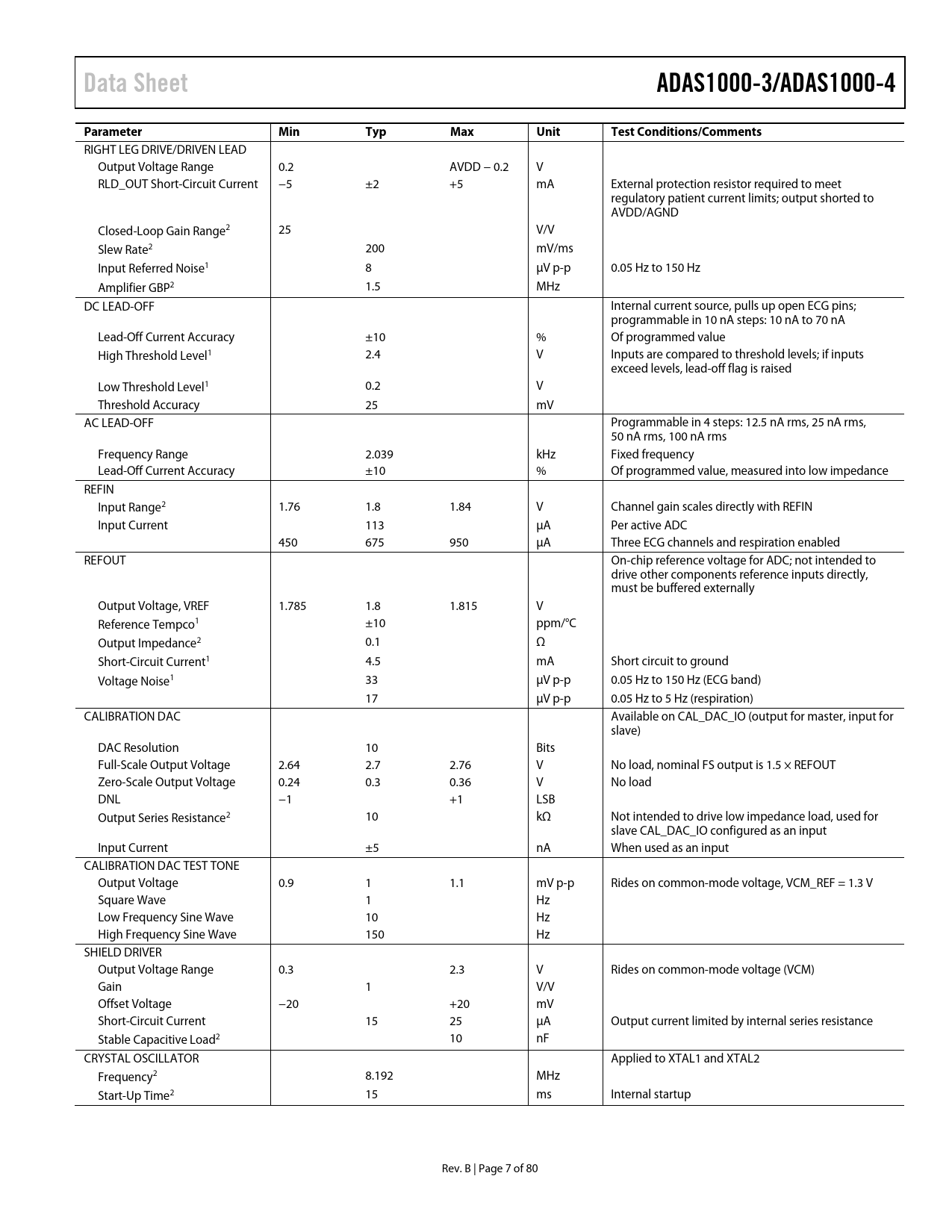 link to page 9 link to page 9 link to page 9 link to page 9 link to page 9 link to page 9 link to page 9 link to page 9 link to page 9 link to page 9 link to page 9 link to page 9 link to page 9 link to page 9 link to page 9 Data SheetADAS1000-3/ADAS1000-4ParameterMinTypMaxUnitTest Conditions/Comments RIGHT LEG DRIVE/DRIVEN LEAD Output Voltage Range 0.2 AVDD − 0.2 V RLD_OUT Short-Circuit Current −5 ±2 +5 mA External protection resistor required to meet regulatory patient current limits; output shorted to AVDD/AGND Closed-Loop Gain Range2 25 V/V Slew Rate2 200 mV/ms Input Referred Noise1 8 μV p-p 0.05 Hz to 150 Hz Amplifier GBP2 1.5 MHz DC LEAD-OFF Internal current source, pulls up open ECG pins; programmable in 10 nA steps: 10 nA to 70 nA Lead-Off Current Accuracy ±10 % Of programmed value High Threshold Level1 2.4 V Inputs are compared to threshold levels; if inputs exceed levels, lead-off flag is raised Low Threshold Level1 0.2 V Threshold Accuracy 25 mV AC LEAD-OFF Programmable in 4 steps: 12.5 nA rms, 25 nA rms, 50 nA rms, 100 nA rms Frequency Range 2.039 kHz Fixed frequency Lead-Off Current Accuracy ±10 % Of programmed value, measured into low impedance REFIN Input Range2 1.76 1.8 1.84 V Channel gain scales directly with REFIN Input Current 113 μA Per active ADC 450 675 950 μA Three ECG channels and respiration enabled REFOUT On-chip reference voltage for ADC; not intended to drive other components reference inputs directly, must be buffered externally Output Voltage, VREF 1.785 1.8 1.815 V Reference Tempco1 ±10 ppm/°C Output Impedance2 0.1 Ω Short-Circuit Current1 4.5 mA Short circuit to ground Voltage Noise1 33 μV p-p 0.05 Hz to 150 Hz (ECG band) 17 μV p-p 0.05 Hz to 5 Hz (respiration) CALIBRATION DAC Available on CAL_DAC_IO (output for master, input for slave) DAC Resolution 10 Bits Full-Scale Output Voltage 2.64 2.7 2.76 V No load, nominal FS output is 1.5 × REFOUT Zero-Scale Output Voltage 0.24 0.3 0.36 V No load DNL −1 +1 LSB Output Series Resistance2 10 kΩ Not intended to drive low impedance load, used for slave CAL_DAC_IO configured as an input Input Current ±5 nA When used as an input CALIBRATION DAC TEST TONE Output Voltage 0.9 1 1.1 mV p-p Rides on common-mode voltage, VCM_REF = 1.3 V Square Wave 1 Hz Low Frequency Sine Wave 10 Hz High Frequency Sine Wave 150 Hz SHIELD DRIVER Output Voltage Range 0.3 2.3 V Rides on common-mode voltage (VCM) Gain 1 V/V Offset Voltage −20 +20 mV Short-Circuit Current 15 25 μA Output current limited by internal series resistance Stable Capacitive Load2 10 nF CRYSTAL OSCILLATOR Applied to XTAL1 and XTAL2 Frequency2 8.192 MHz Start-Up Time2 15 ms Internal startup Rev. B | Page 7 of 80 Document Outline FEATURES APPLICATIONS GENERAL DESCRIPTION TABLE OF CONTENTS REVISION HISTORY FUNCTIONAL BLOCK DIAGRAM SPECIFICATIONS NOISE PERFORMANCE TIMING CHARACTERISTICS Standard Serial Interface Secondary Serial Interface (Master Interface for Customer-Based Digital Pace Algorithm) ADAS1000-4 Only ABSOLUTE MAXIMUM RATINGS THERMAL RESISTANCE ESD CAUTION PIN CONFIGURATIONS AND FUNCTION DESCRIPTIONS TYPICAL PERFORMANCE CHARACTERISTICS APPLICATIONS INFORMATION OVERVIEW ECG INPUTS—ELECTRODES/LEADS ECG CHANNEL ELECTRODE/LEAD FORMATION AND INPUT STAGE CONFIGURATION Analog Lead Mode and Calculation Digital Lead Mode and Calculation Electrode Mode: Single-Ended Input Electrode Configuration Electrode Mode: Common Electrode A and Common Electrode B Configurations DEFIBRILLATOR PROTECTION ESIS FILTERING ECG PATH INPUT MULTIPLEXING COMMON-MODE SELECTION AND AVERAGING WILSON CENTRAL TERMINAL (WCT) RIGHT LEG DRIVE/REFERENCE DRIVE CALIBRATION DAC GAIN CALIBRATION LEAD-OFF DETECTION DC Lead-Off Detection DC Lead-Off and High Gains AC Lead-Off Detection ADC Out of Range SHIELD DRIVER RESPIRATION (ADAS1000-4 MODEL ONLY) Internal Respiration Capacitors External Respiration Path External Respiration Capacitors Respiration Carrier Frequency EVALUATING RESPIRATION PERFORMANCE PACING ARTIFACT DETECTION FUNCTION (ADAS1000-4 ONLY) Choice of Leads Detection Algorithm Overview Pace Edge Threshold Pace Level Threshold Pace Amplitude Threshold Pace Validation Filters Pace Width Filter BIVENTRICULAR PACERS PACE DETECTION MEASUREMENTS EVALUATING PACE DETECTION PERFORMANCE PACE WIDTH PACE LATENCY PACE DETECTION VIA SECONDARY SERIAL INTERFACE FILTERING VOLTAGE REFERENCE GANG MODE OPERATION Master/Slave Synchronizing Devices Calibration Common Mode Right Leg Drive Sequencing Devices into Gang Mode INTERFACING IN GANG MODE SERIAL INTERFACES STANDARD SERIAL INTERFACE Write Mode Write/Read Data Format Data Frames/Packets Read Mode Serial Clock Rate Data Rate and Skip Mode Data Ready (DRDY) Detecting Missed Conversion Data CRC Word Clocks SECONDARY SERIAL INTERFACE RESET PD FUNCTION SPI OUTPUT FRAME STRUCTURE (ECG AND STATUS DATA) SPI REGISTER DEFINITIONS AND MEMORY MAP CONTROL REGISTERS DETAILS INTERFACE EXAMPLES Example 1: Initialize the Device for ECG Capture and Start Streaming Data Example 2: Enable Respiration and Stream Conversion Data (Applies to ADAS1000-4 Only) Example 3: DC Lead-Off and Stream Conversion Data Example 4: Configure 150 Hz Test Tone Sine Wave on Each ECG Channel and Stream Conversion Data Example 5: Enable Pace Detection and Stream Conversion Data (Applies to ADAS1000-4 Only) Example 6: Writing to Master and Slave Devices and Streaming Conversion Data Slave Configuration (ADAS1000-3) Master Configuration (ADAS1000) SOFTWARE FLOWCHART POWER SUPPLY, GROUNDING, AND DECOUPLING STRATEGY AVDD ADCVDD AND DVDD SUPPLIES UNUSED PINS/PATHS LAYOUT RECOMMENDATIONS OUTLINE DIMENSIONS ORDERING GUIDE