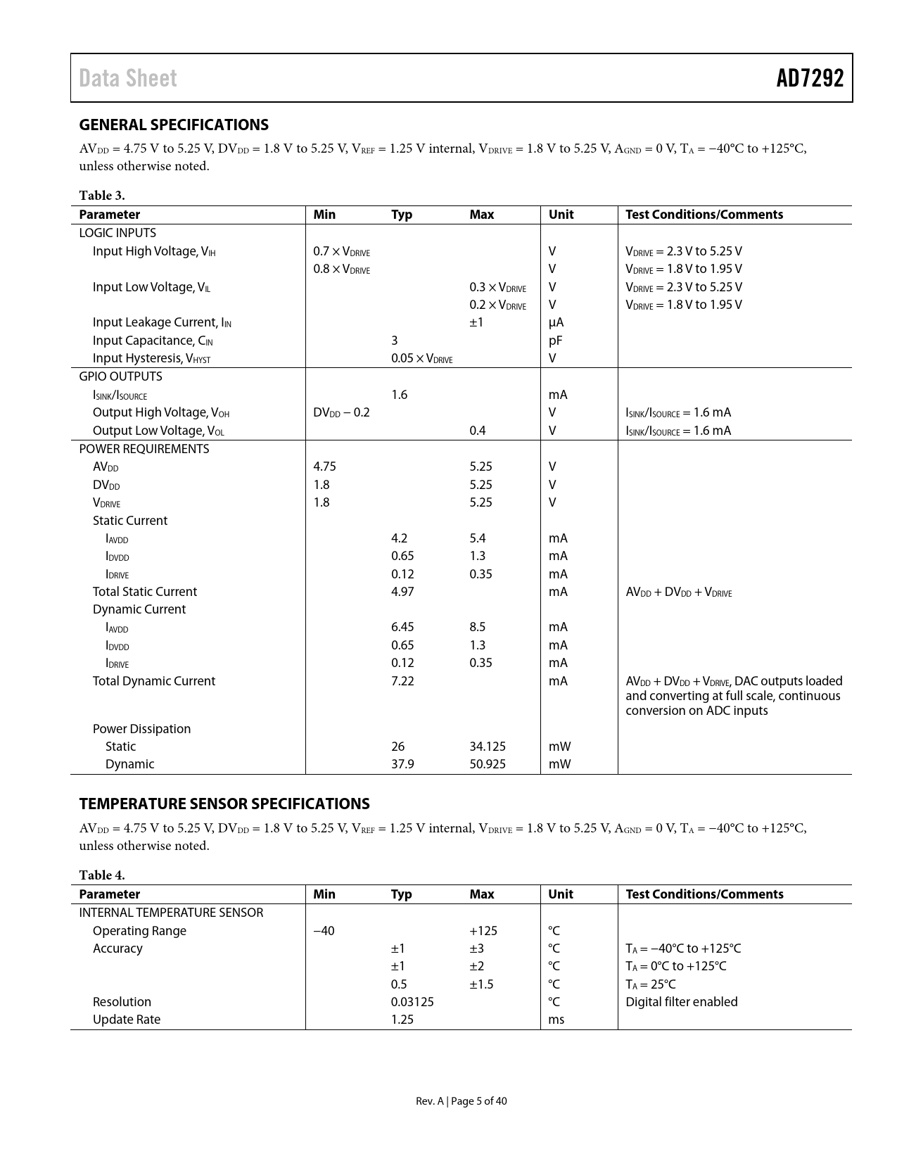 页数 / 页40 / 5 — Data Sheet. AD7292. GENERAL SPECIFICATIONS. Table 3. Parameter. Min. Typ. …