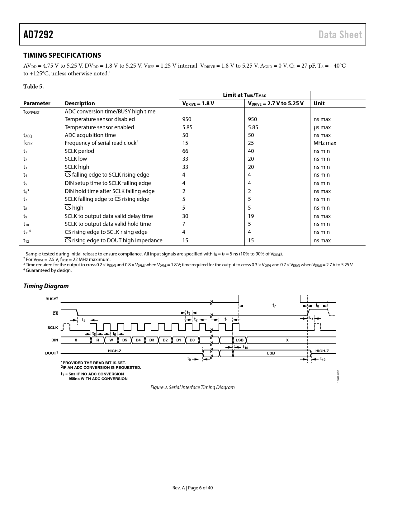 AD7292Data SheetTIMING SPECIFICATIONS AVDD = 4.75 V to 5.25 V, DVDD = 1.8 V to 5.25 V, VREF = 1.25 V internal, VDRIVE = 1.8 V to 5.25 V, AGND = 0 V, CL = 27 pF, TA = −40°C to +125°C, unless otherwise noted.1 Table 5.LimitatTMIN/TMAXParameter DescriptionVDRIVE = 1.8 VVDRIVE = 2.7 V to 5.25 VUnit tCONVERT ADC conversion time/BUSY high time Temperature sensor disabled 950 950 ns max Temperature sensor enabled 5.85 5.85 μs max tACQ ADC acquisition time 50 50 ns max fSCLK Frequency of serial read clock2 15 25 MHz max t1 SCLK period 66 40 ns min t2 SCLK low 33 20 ns min t3 SCLK high 33 20 ns min t4 CS falling edge to SCLK rising edge 4 4 ns min t5 DIN setup time to SCLK falling edge 4 4 ns min t 3 6 DIN hold time after SCLK falling edge 2 2 ns max t7 SCLK falling edge to CS rising edge 5 5 ns min t8 CS high 5 5 ns min t9 SCLK to output data valid delay time 30 19 ns max t10 SCLK to output data valid hold time 7 5 ns min t 4 11 CS rising edge to SCLK rising edge 4 4 ns min t12 CS rising edge to DOUT high impedance 15 15 ns max 1 Sample tested during initial release to ensure compliance. All input signals are specified with tR = tF = 5 ns (10% to 90% of VDRIVE). 2 For VDRIVE = 2.5 V, fSCLK = 22 MHz maximum. 3 Time required for the output to cross 0.2 × VDRIVE and 0.8 × VDRIVE when VDRIVE = 1.8 V; time required for the output to cross 0.3 × VDRIVE and 0.7 × VDRIVE when VDRIVE = 2.7 V to 5.25 V. 4 Guaranteed by design. Timing DiagramBUSY2t7t8tCS3ttt1142t1SCLKt5t6DINXRWD5D4D3D2D1D0LSBXt10HIGH-ZHIGH-ZDOUT1LSBtt9121PROVIDED THE READ BIT IS SET. 2IF AN ADC CONVERSION IS REQUESTED. 2 t -00 7 = 5ns IF NO ADC CONVERSION 60 955ns WITH ADC CONVERSION 106 Figure 2. Serial Interface Timing Diagram Rev. A | Page 6 of 40 Document Outline Features Applications Functional Block Diagram General Description Table of Contents Revision History Specifications ADC Specifications DAC Specifications General Specifications Temperature Sensor Specifications Timing Specifications Timing Diagram Absolute Maximum Ratings Thermal Resistance ESD Caution Pin Configuration and Function Descriptions Typical Performance Characteristics Theory of Operation Analog Inputs Single-Ended Mode Differential Mode ADC Transfer Functions Temperature Sensor DAC Operation Digital I/O Pins GPIO0/ALERT0 and GPIO1/ALERT1 Pins GPIO2/DAC DISABLE0 and GPIO4/DAC DISABLE1 Pins GPIO3/LDAC Pin GPIO6/BUSY Pin Serial Port Interface (SPI) Interface Protocol Register Structure Register Descriptions Vendor ID Register (Address 0x00) ADC Data Register (Address 0x01) ADC Sequence Register (Address 0x03) Configuration Register Bank (Address 0x05) Digital Output Driver Subregister (Address 0x01) Digital I/O Function Subregister (Address 0x02) General Subregister (Address 0x08) VIN RANGE0 and VIN RANGE1 Subregisters (Address 0x10 and Address 0x11) ADC Sampling Mode Subregister (Address 0x12) VIN Filter Subregister (Address 0x13) Conversion Delay Control Subregister (Address 0x14) VIN ALERT0 Routing and VIN ALERT1 Routing Subregisters (Address 0x15 and Address 0x16) Temperature Sensor Subregister (Address 0x20) Temperature Sensor Alert Routing Subregister (Address 0x21) GPIO2/DAC DISABLE0 and GPIO4/DAC DISABLE1 Subregisters (Address 0x30 and Address 0x31) Alert Limits Register Bank (Address 0x06) Alert High Limit and Alert Low Limit Subregisters Hysteresis Subregisters Alert Flags Register Bank (Address 0x07) ADC Alert Flags and TSENSE Alert Flags Subregisters (Address 0x00 and Address 0x02) Minimum and Maximum Register Bank (Address 0x08) Offset Register Bank (Address 0x09) DAC Buffer Enable Register (Address 0x0A) GPIO Register (Address 0x0B) Conversion Command Register (Address 0x0E) ADC Conversion Result Registers, VIN0 to VIN7 (Address 0x10 to Address 0x17) TSENSE Conversion Result Register (Address 0x20) DAC Channel Registers (Address 0x30 to Address 0x33) ADC Conversion Control ADC Conversion Command ADC Sequencer DAC Output Control LDAC Operation Simultaneous Update of All DAC Outputs Alerts and Limits Alert Limit Monitoring Features Hysteresis Hardware Alert Pins Alert Flag Bits in the Conversion Result Registers Alert Flags Register Bank Minimum and Maximum Conversion Results Outline Dimensions Ordering Guide