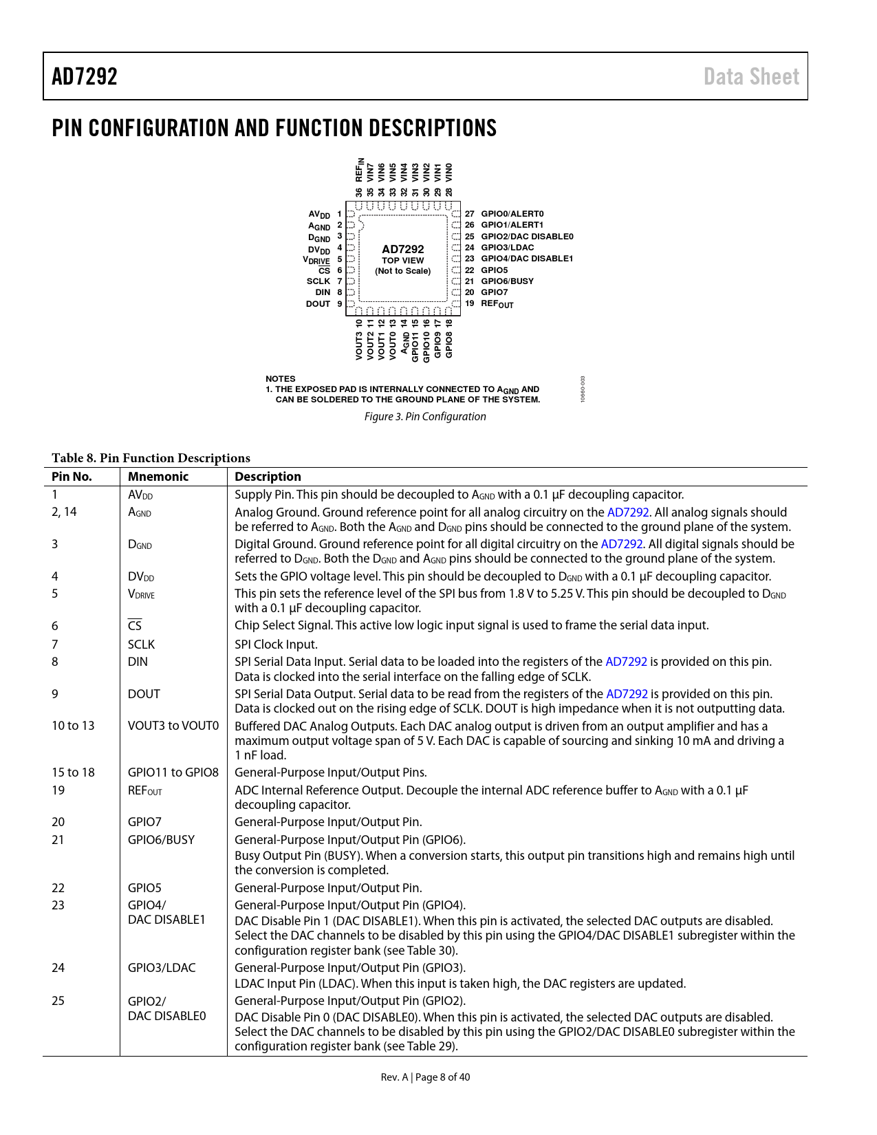 link to page 29 link to page 29 AD7292Data SheetPIN CONFIGURATION AND FUNCTION DESCRIPTIONSINF 7 6 5 4 3 2 1 0ININININININININREVVVVVVVV363534333231302928AV1DD27 GPIO0/ALERT0A2GND26 GPIO1/ALERT1D325 GPIO2/DAC DISABLE0GND4DV24 GPIO3/LDACDDAD7292V5DRIVE23 GPIO4/DAC DISABLE1TOP VIEWCS 6(Not to Scale)22 GPIO5SCLK 721 GPIO6/BUSYDIN 820 GPIO7DOUT 919 REFOUT1011121314151617183210D10TTTT11UUUUGNIO9IO8IOAIOVOVOVOVOGPGPGPGPNOTES -003 1. THE EXPOSED PAD IS INTERNALLY CONNECTED TO AGND AND CAN BE SOLDERED TO THE GROUND PLANE OF THE SYSTEM. 0660 1 Figure 3. Pin Configuration Table 8. Pin Function Descriptions Pin No.MnemonicDescription 1 AVDD Supply Pin. This pin should be decoupled to AGND with a 0.1 μF decoupling capacitor. 2, 14 AGND Analog Ground. Ground reference point for all analog circuitry on the AD7292. All analog signals should be referred to AGND. Both the AGND and DGND pins should be connected to the ground plane of the system. 3 DGND Digital Ground. Ground reference point for all digital circuitry on the AD7292. All digital signals should be referred to DGND. Both the DGND and AGND pins should be connected to the ground plane of the system. 4 DVDD Sets the GPIO voltage level. This pin should be decoupled to DGND with a 0.1 μF decoupling capacitor. 5 VDRIVE This pin sets the reference level of the SPI bus from 1.8 V to 5.25 V. This pin should be decoupled to DGND with a 0.1 μF decoupling capacitor. 6 CS Chip Select Signal. This active low logic input signal is used to frame the serial data input. 7 SCLK SPI Clock Input. 8 DIN SPI Serial Data Input. Serial data to be loaded into the registers of the AD7292 is provided on this pin. Data is clocked into the serial interface on the falling edge of SCLK. 9 DOUT SPI Serial Data Output. Serial data to be read from the registers of the AD7292 is provided on this pin. Data is clocked out on the rising edge of SCLK. DOUT is high impedance when it is not outputting data. 10 to 13 VOUT3 to VOUT0 Buffered DAC Analog Outputs. Each DAC analog output is driven from an output amplifier and has a maximum output voltage span of 5 V. Each DAC is capable of sourcing and sinking 10 mA and driving a 1 nF load. 15 to 18 GPIO11 to GPIO8 General-Purpose Input/Output Pins. 19 REFOUT ADC Internal Reference Output. Decouple the internal ADC reference buffer to AGND with a 0.1 μF decoupling capacitor. 20 GPIO7 General-Purpose Input/Output Pin. 21 GPIO6/BUSY General-Purpose Input/Output Pin (GPIO6). Busy Output Pin (BUSY). When a conversion starts, this output pin transitions high and remains high until the conversion is completed. 22 GPIO5 General-Purpose Input/Output Pin. 23 GPIO4/ General-Purpose Input/Output Pin (GPIO4). DAC DISABLE1 DAC Disable Pin 1 (DAC DISABLE1). When this pin is activated, the selected DAC outputs are disabled. Select the DAC channels to be disabled by this pin using the GPIO4/DAC DISABLE1 subregister within the configuration register bank (see Table 30). 24 GPIO3/LDAC General-Purpose Input/Output Pin (GPIO3). LDAC Input Pin (LDAC). When this input is taken high, the DAC registers are updated. 25 GPIO2/ General-Purpose Input/Output Pin (GPIO2). DAC DISABLE0 DAC Disable Pin 0 (DAC DISABLE0). When this pin is activated, the selected DAC outputs are disabled. Select the DAC channels to be disabled by this pin using the GPIO2/DAC DISABLE0 subregister within the configuration register bank (see Table 29). Rev. A | Page 8 of 40 Document Outline Features Applications Functional Block Diagram General Description Table of Contents Revision History Specifications ADC Specifications DAC Specifications General Specifications Temperature Sensor Specifications Timing Specifications Timing Diagram Absolute Maximum Ratings Thermal Resistance ESD Caution Pin Configuration and Function Descriptions Typical Performance Characteristics Theory of Operation Analog Inputs Single-Ended Mode Differential Mode ADC Transfer Functions Temperature Sensor DAC Operation Digital I/O Pins GPIO0/ALERT0 and GPIO1/ALERT1 Pins GPIO2/DAC DISABLE0 and GPIO4/DAC DISABLE1 Pins GPIO3/LDAC Pin GPIO6/BUSY Pin Serial Port Interface (SPI) Interface Protocol Register Structure Register Descriptions Vendor ID Register (Address 0x00) ADC Data Register (Address 0x01) ADC Sequence Register (Address 0x03) Configuration Register Bank (Address 0x05) Digital Output Driver Subregister (Address 0x01) Digital I/O Function Subregister (Address 0x02) General Subregister (Address 0x08) VIN RANGE0 and VIN RANGE1 Subregisters (Address 0x10 and Address 0x11) ADC Sampling Mode Subregister (Address 0x12) VIN Filter Subregister (Address 0x13) Conversion Delay Control Subregister (Address 0x14) VIN ALERT0 Routing and VIN ALERT1 Routing Subregisters (Address 0x15 and Address 0x16) Temperature Sensor Subregister (Address 0x20) Temperature Sensor Alert Routing Subregister (Address 0x21) GPIO2/DAC DISABLE0 and GPIO4/DAC DISABLE1 Subregisters (Address 0x30 and Address 0x31) Alert Limits Register Bank (Address 0x06) Alert High Limit and Alert Low Limit Subregisters Hysteresis Subregisters Alert Flags Register Bank (Address 0x07) ADC Alert Flags and TSENSE Alert Flags Subregisters (Address 0x00 and Address 0x02) Minimum and Maximum Register Bank (Address 0x08) Offset Register Bank (Address 0x09) DAC Buffer Enable Register (Address 0x0A) GPIO Register (Address 0x0B) Conversion Command Register (Address 0x0E) ADC Conversion Result Registers, VIN0 to VIN7 (Address 0x10 to Address 0x17) TSENSE Conversion Result Register (Address 0x20) DAC Channel Registers (Address 0x30 to Address 0x33) ADC Conversion Control ADC Conversion Command ADC Sequencer DAC Output Control LDAC Operation Simultaneous Update of All DAC Outputs Alerts and Limits Alert Limit Monitoring Features Hysteresis Hardware Alert Pins Alert Flag Bits in the Conversion Result Registers Alert Flags Register Bank Minimum and Maximum Conversion Results Outline Dimensions Ordering Guide