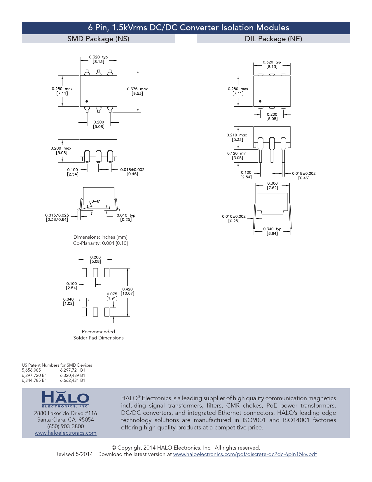 6. Pin,. 1.5kVrms. DC/DC. Converter. Isolation. Modules. SMD. Package. (NS). DIL. Package. (NE). Dimensions:. inches. [mm]. Co-Planarity:. 0.004. [0.10]