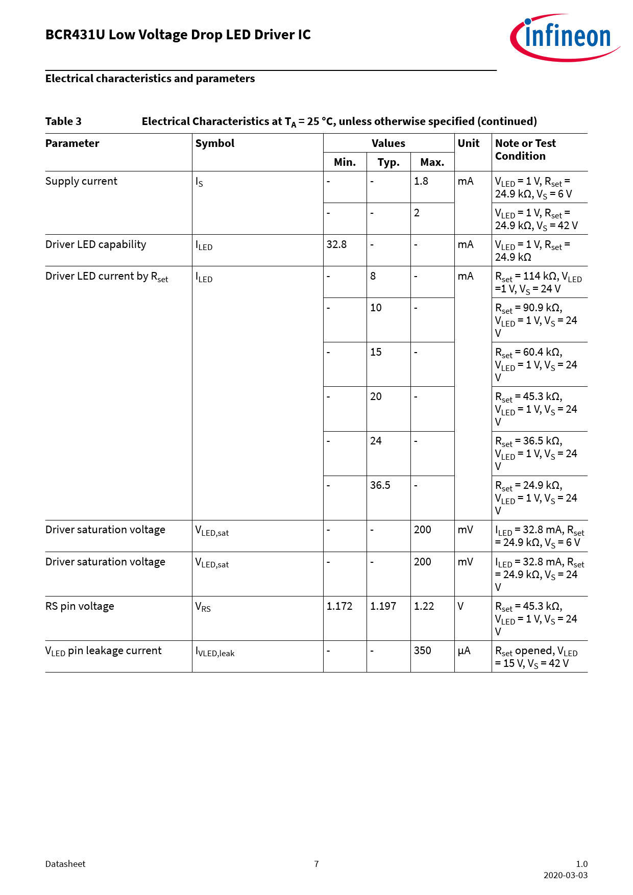 BCR431U Low Voltage Drop LED Driver IC. Electrical characteristics and parameters. Table 3