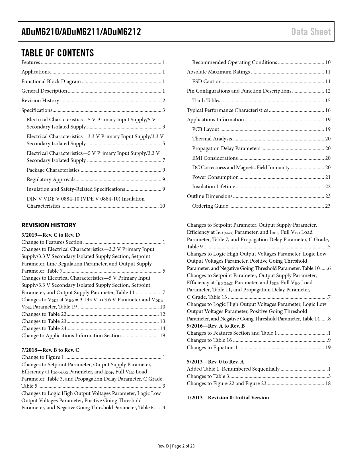 link to page 1 link to page 1 link to page 1 link to page 1 link to page 2 link to page 3 link to page 3 link to page 3 link to page 5 link to page 5 link to page 7 link to page 7 link to page 9 link to page 9 link to page 9 link to page 10 link to page 10 link to page 10 link to page 11 link to page 11 link to page 12 link to page 15 link to page 16 link to page 19 link to page 19 link to page 20 link to page 20 link to page 20 link to page 20 link to page 21 link to page 22 link to page 23 link to page 23 ADuM6210/ADuM6211/ADuM6212Data SheetTABLE OF CONTENTS Features .. 1 Recommended Operating Conditions .. 10 Applications ... 1 Absolute Maximum Ratings ... 11 Functional Block Diagram .. 1 ESD Caution.. 11 General Description ... 1 Pin Configurations and Function Descriptions ... 12 Revision History ... 2 Truth Tables... 15 Specifications ... 3 Typical Performance Characteristics ... 16 Electrical Characteristics—5 V Primary Input Supply/5 V Applications Information .. 19 Secondary Isolated Supply .. 3 PCB Layout ... 19 Electrical Characteristics—3.3 V Primary Input Supply/3.3 V Thermal Analysis ... 20 Secondary Isolated Supply .. 5 Propagation Delay Parameters ... 20 Electrical Characteristics—5 V Primary Input Supply/3.3 V Secondary Isolated Supply .. 7 EMI Considerations ... 20 Package Characteristics ... 9 DC Correctness and Magnetic Field Immunity ... 20 Regulatory Approvals ... 9 Power Consumption .. 21 Insulation and Safety-Related Specifications .. 9 Insulation Lifetime ... 22 DIN V VDE V 0884-10 (VDE V 0884-10) Insulation Outline Dimensions ... 23 Characteristics .. 10 Ordering Guide .. 23 REVISION HISTORY Changes to Setpoint Parameter, Output Supply Parameter, 3/2019—Rev. C to Rev. D Efficiency at IISO (MAX) Parameter, and IDDP, Full VISO Load Change to Features Section ... 1 Parameter, Table 7, and Propagation Delay Parameter, C Grade, Changes to Electrical Characteristics—3.3 V Primary Input Table 9 ... 5 Supply/3.3 V Secondary Isolated Supply Section, Setpoint Changes to Logic High Output Voltages Parameter, Logic Low Parameter, Line Regulation Parameter, and Output Supply Output Voltages Parameter, Positive Going Threshold Parameter, Table 7 ... 5 Parameter, and Negative Going Threshold Parameter, Table 10 .. 6 Changes to Electrical Characteristics—5 V Primary Input Changes to Setpoint Parameter, Output Supply Parameter, Supply/3.3 V Secondary Isolated Supply Section, Setpoint Efficiency at IISO (MAX) Parameter, and IDDP, Full VISO Load Parameter, and Output Supply Parameter, Table 11 .. 7 Parameter, Table 11, and Propagation Delay Parameter, Changes to V C Grade, Table 13 .. 7 DDP at VISO = 3.135 V to 3.6 V Parameter and VDD1, V Changes to Logic High Output Voltages Parameter, Logic Low DD2 Parameter, Table 19 ... 10 Changes to Table 22 .. 12 Output Voltages Parameter, Positive Going Threshold Changes to Table 23 .. 13 Parameter, and Negative Going Threshold Parameter, Table 14 .. 8 Changes to Table 24 .. 14 9/2016—Rev. A to Rev. B Change to Applications Information Section ... 19 Changes to Features Section and Table 1 ... 1 Changes to Table 16 .. 9 7/2018—Rev. B to Rev. C Changes to Equation 1 ... 19 Change to Figure 1 ... 1 Changes to Setpoint Parameter, Output Supply Parameter, 5/2013—Rev. 0 to Rev. A Efficiency at I Added Table 1, Renumbered Sequentially ... 1 ISO (MAX) Parameter, and IDDP, Full VISO Load Parameter, Table 3, and Propagation Delay Parameter, C Grade, Changes to Table 3 ... 3 Table 5 .. 3 Changes to Figure 22 and Figure 23... 18 Changes to Logic High Output Voltages Parameter, Logic Low Output Voltages Parameter, Positive Going Threshold 1/2013—Revision 0: Initial Version Parameter, and Negative Going Threshold Parameter, Table 6 .. 4 Rev. D | Page 2 of 23 Document Outline FEATURES APPLICATIONS FUNCTIONAL BLOCK DIAGRAM GENERAL DESCRIPTION TABLE OF CONTENTS REVISION HISTORY SPECIFICATIONS ELECTRICAL CHARACTERISTICS—5 V PRIMARY INPUT SUPPLY/5 V SECONDARY ISOLATED SUPPLY ELECTRICAL CHARACTERISTICS—3.3 V PRIMARY INPUT SUPPLY/3.3 V SECONDARY ISOLATED SUPPLY ELECTRICAL CHARACTERISTICS—5 V PRIMARY INPUT SUPPLY/3.3 V SECONDARY ISOLATED SUPPLY PACKAGE CHARACTERISTICS REGULATORY APPROVALS INSULATION AND SAFETY-RELATED SPECIFICATIONS DIN V VDE V 0884-10 (VDE V 0884-10) INSULATION CHARACTERISTICS RECOMMENDED OPERATING CONDITIONS ABSOLUTE MAXIMUM RATINGS ESD CAUTION PIN CONFIGURATIONS AND FUNCTION DESCRIPTIONS TRUTH TABLES TYPICAL PERFORMANCE CHARACTERISTICS APPLICATIONS INFORMATION PCB LAYOUT THERMAL ANALYSIS PROPAGATION DELAY PARAMETERS EMI CONSIDERATIONS DC CORRECTNESS AND MAGNETIC FIELD IMMUNITY POWER CONSUMPTION INSULATION LIFETIME OUTLINE DIMENSIONS ORDERING GUIDE