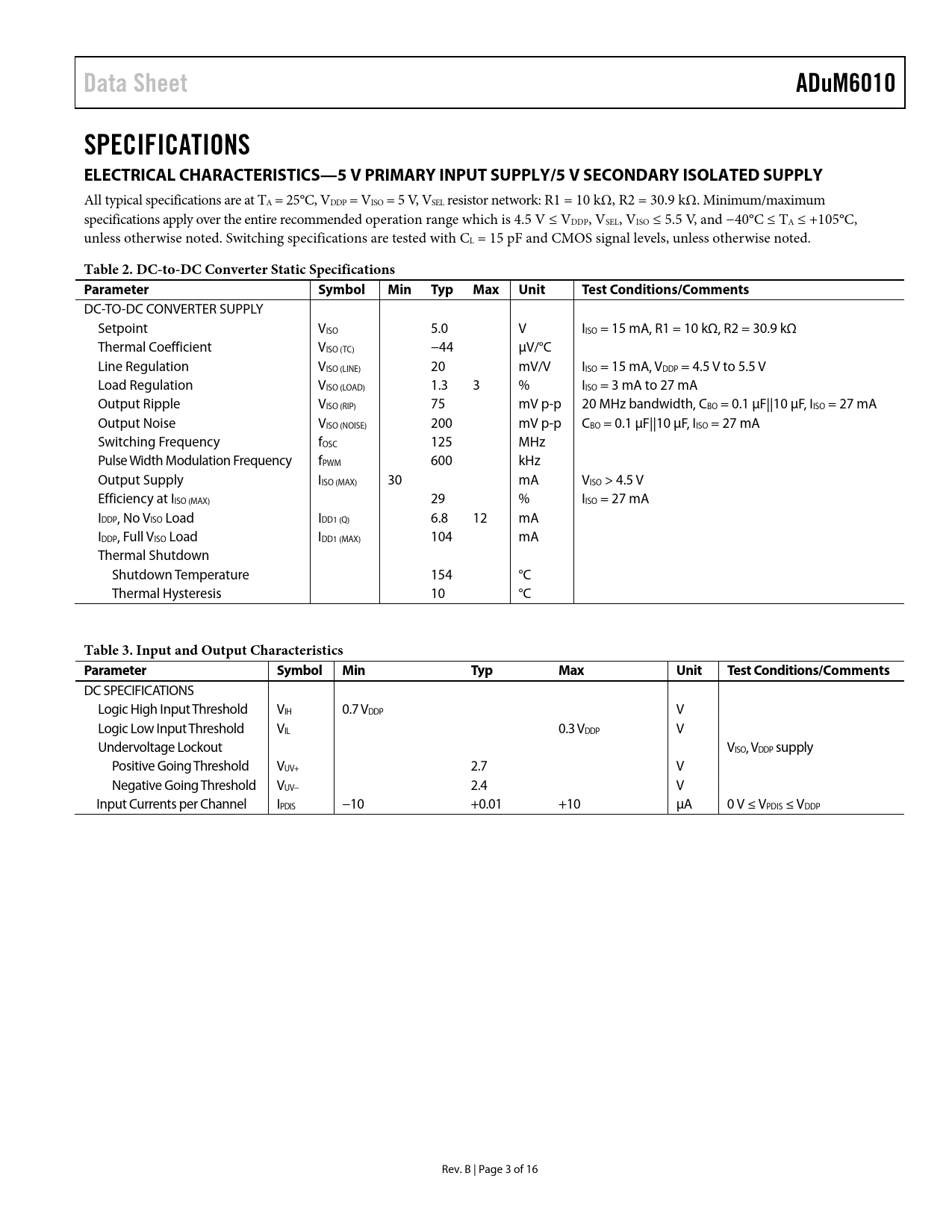 页数 / 页16 / 3 — Data Sheet. ADuM6010. SPECIFICATIONS ELECTRICAL CHARACTERISTICS—5 V …