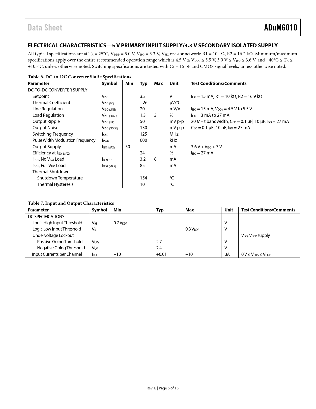 Data Sheet. ADuM6010. ELECTRICAL CHARACTERISTICS—5 V PRIMARY INPUT SUPPLY/3.3 V SECONDARY ISOLATED SUPPLY