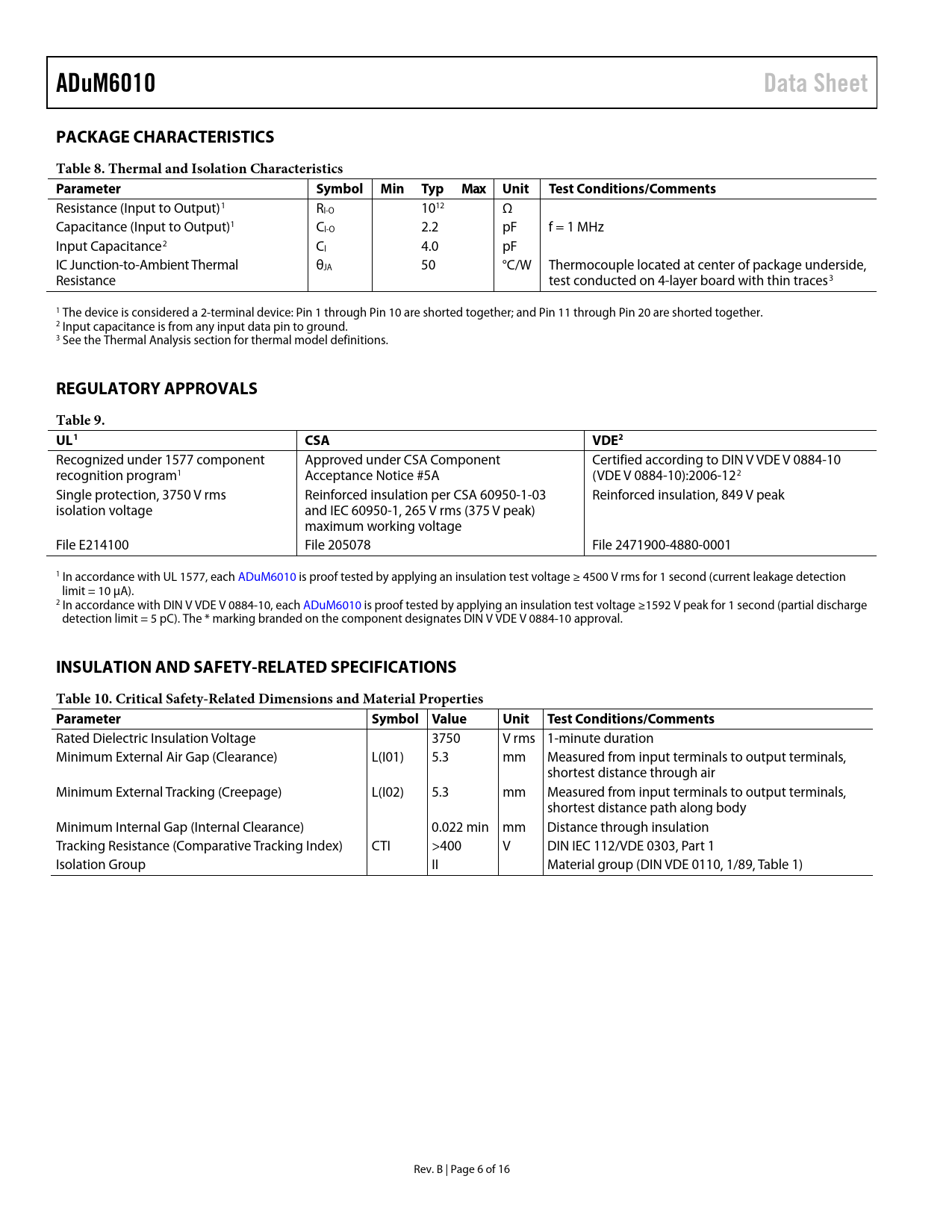 ADuM6010. Data Sheet. PACKAGE CHARACTERISTICS. Table 8. Thermal and Isolation Characteristics Parameter