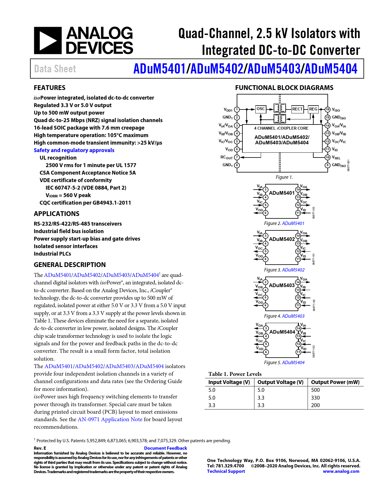 Quad-Channel, 2.5 kV Isolators with. Integrated DC-to-DC Converter. Data Sheet. ADuM5401/. ADuM5402/. ADuM5403/. ADuM5404. FEATURES