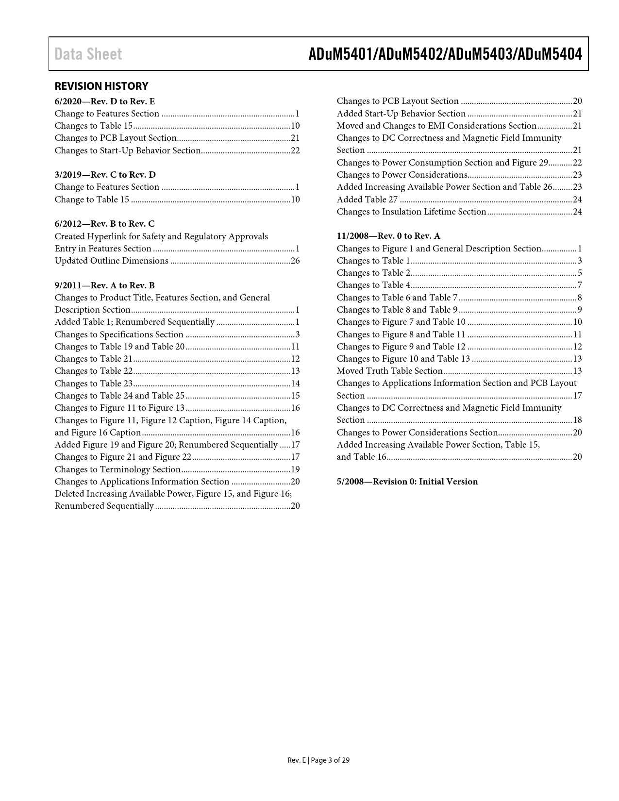 Data SheetADuM5401/ADuM5402/ADuM5403/ADuM5404REVISION HISTORY6/2020—Rev. D to Rev. E Changes to PCB Layout Section ... 20 Change to Features Section ... 1 Added Start-Up Behavior Section .. 21 Changes to Table 15 .. 10 Moved and Changes to EMI Considerations Section .. 21 Changes to PCB Layout Section .. 21 Changes to DC Correctness and Magnetic Field Immunity Changes to Start-Up Behavior Section ... 22 Section .. 21 Changes to Power Consumption Section and Figure 29 ... 22 3/2019—Rev. C to Rev. D Changes to Power Considerations.. 23 Change to Features Section ... 1 Added Increasing Available Power Section and Table 26 ... 23 Change to Table 15 ... 10 Added Table 27 ... 24 Changes to Insulation Lifetime Section ... 24 6/2012—Rev. B to Rev. C Created Hyperlink for Safety and Regulatory Approvals 11/2008—Rev. 0 to Rev. A Entry in Features Section ... 1 Changes to Figure 1 and General Description Section .. 1 Updated Outline Dimensions ... 26 Changes to Table 1 .. 3 Changes to Table 2 .. 5 9/2011—Rev. A to Rev. B Changes to Table 4 .. 7 Changes to Product Title, Features Section, and General Changes to Table 6 and Table 7 .. 8 Description Section ... 1 Changes to Table 8 and Table 9 .. 9 Added Table 1; Renumbered Sequentially .. 1 Changes to Figure 7 and Table 10 .. 10 Changes to Specifications Section .. 3 Changes to Figure 8 and Table 11 .. 11 Changes to Table 19 and Table 20 .. 11 Changes to Figure 9 and Table 12 .. 12 Changes to Table 21 .. 12 Changes to Figure 10 and Table 13 .. 13 Changes to Table 22 .. 13 Moved Truth Table Section ... 13 Changes to Table 23 .. 14 Changes to Applications Information Section and PCB Layout Changes to Table 24 and Table 25 .. 15 Section .. 17 Changes to Figure 11 to Figure 13 .. 16 Changes to DC Correctness and Magnetic Field Immunity Changes to Figure 11, Figure 12 Caption, Figure 14 Caption, Section .. 18 and Figure 16 Caption .. 16 Changes to Power Considerations Section.. 20 Added Figure 19 and Figure 20; Renumbered Sequentially ... 17 Added Increasing Available Power Section, Table 15, Changes to Figure 21 and Figure 22 ... 17 and Table 16 ... 20 Changes to Terminology Section .. 19 Changes to Applications Information Section ... 20 5/2008—Revision 0: Initial Version Deleted Increasing Available Power, Figure 15, and Figure 16; Renumbered Sequentially .. 20 Rev. E | Page 3 of 29 Document Outline FEATURES APPLICATIONS GENERAL DESCRIPTION FUNCTIONAL BLOCK DIAGRAMS TABLE OF CONTENTS REVISION HISTORY SPECIFICATIONS ELECTRICAL CHARACTERISTICS—5 V PRIMARY INPUT SUPPLY/5 V SECONDARY ISOLATED SUPPLY ELECTRICAL CHARACTERISTICS—3.3 V PRIMARY INPUT SUPPLY/3.3 V SECONDARY ISOLATED SUPPLY ELECTRICAL CHARACTERISTICS—5 V PRIMARY INPUT SUPPLY/3.3 V SECONDARY ISOLATED SUPPLY PACKAGE CHARACTERISTICS REGULATORY INFORMATION INSULATION AND SAFETY-RELATED SPECIFICATIONS IEC 60747-5-2 (VDE 0884, PART 2):2003-01 INSULATION CHARACTERISTICS RECOMMENDED OPERATING CONDITIONS ABSOLUTE MAXIMUM RATINGS ESD CAUTION PIN CONFIGURATIONS AND FUNCTION DESCRIPTIONS TRUTH TABLE TYPICAL PERFORMANCE CHARACTERISTICS TERMINOLOGY APPLICATIONS INFORMATION PCB LAYOUT THERMAL ANALYSIS PROPAGATION DELAY-RELATED PARAMETERS START-UP BEHAVIOR EMI CONSIDERATIONS DC CORRECTNESS AND MAGNETIC FIELD IMMUNITY POWER CONSUMPTION POWER CONSIDERATIONS INCREASING AVAILABLE POWER INSULATION LIFETIME OUTLINE DIMENSIONS ORDERING GUIDE NOTES NOTES