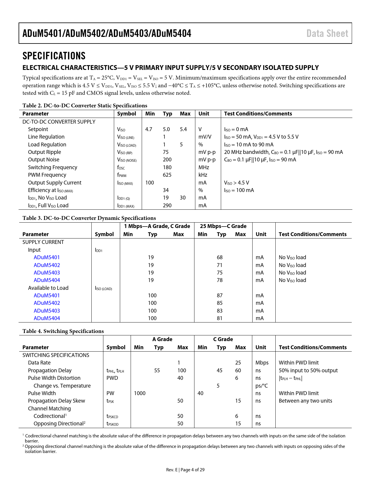 ADuM5401/ADuM5402/ADuM5403/ADuM5404 Data Sheet SPECIFICATIONS ELECTRICAL CHARACTERISTICS—5 V PRIMARY INPUT SUPPLY/5 V SECONDARY ISOLATED SUPPLY