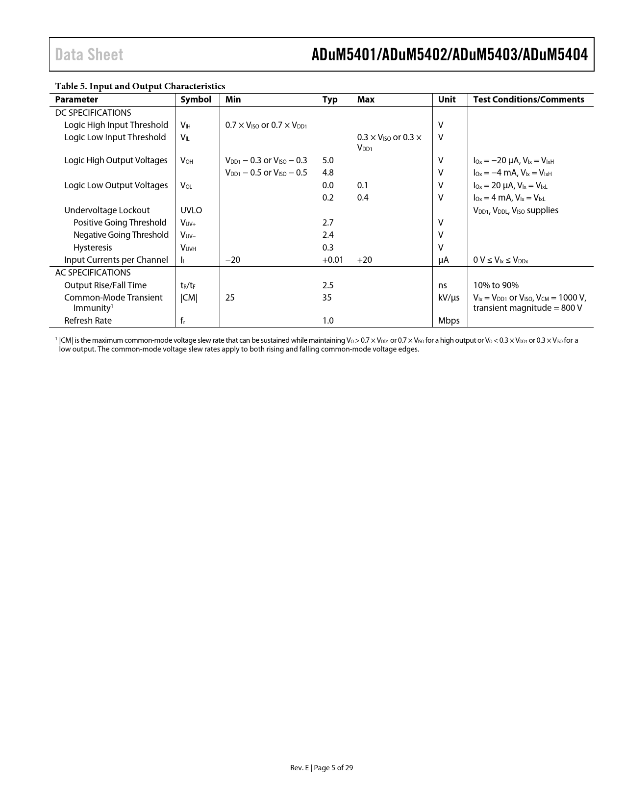Data Sheet. ADuM5401/ADuM5402/ADuM5403/ADuM5404. Table 5. Input and Output Characteristics Parameter Symbol. Min Typ. Max. Unit