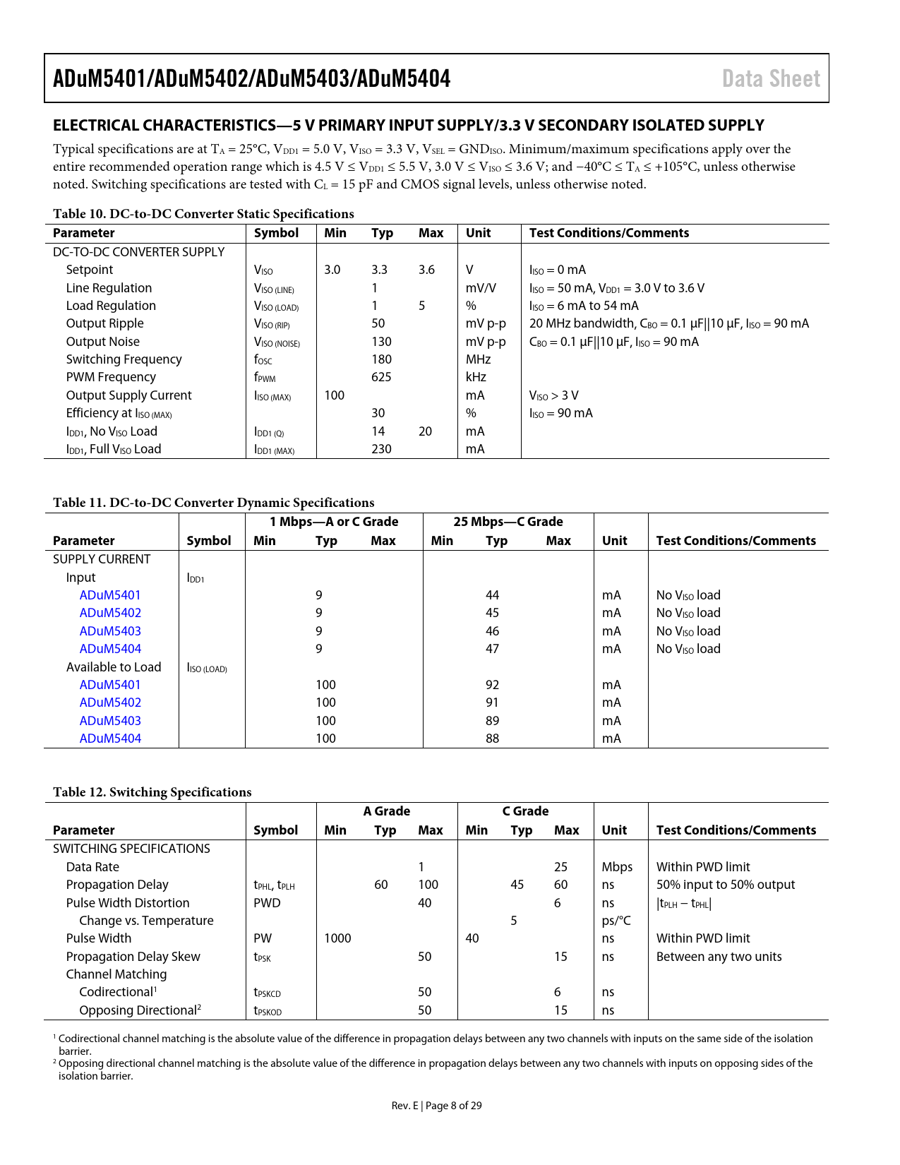 ADuM5401/ADuM5402/ADuM5403/ADuM5404 Data Sheet ELECTRICAL CHARACTERISTICS—5 V PRIMARY INPUT SUPPLY/3.3 V SECONDARY ISOLATED SUPPLY