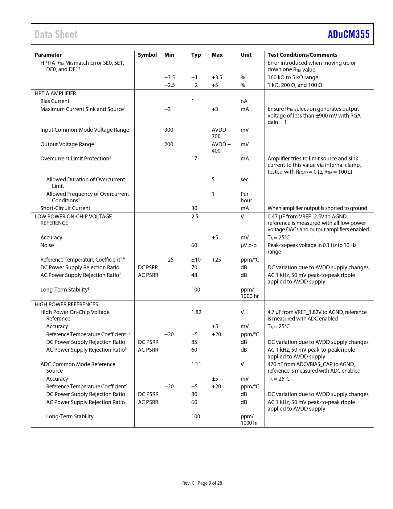 页数 / 页28 / 9 — Data Sheet. ADuCM355. Parameter Symbol. Min. Typ. Max. Unit. Test. …