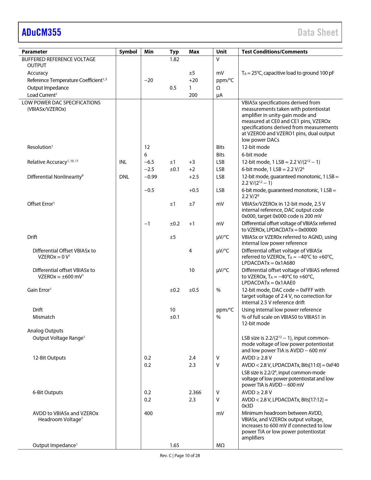 页数 / 页28 / 10 — ADuCM355. Data Sheet. Parameter Symbol. Min. Typ. Max. Unit. Test. …