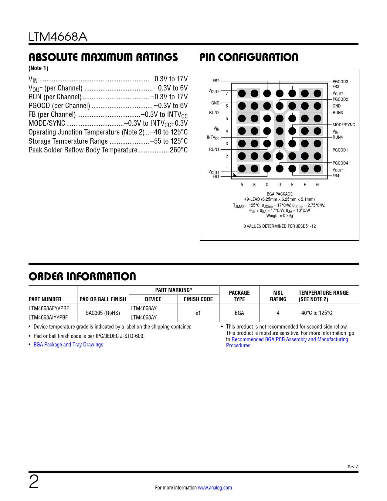 LTM4668AEY#PBF LTM4668AY SAC305 (RoHS) e1 BGA 4 –40°C to 125°C LTM4668AIY#PBF LTM4668AY • Device temperature grade is indicated by a label on the shipping container. • This product is not recommended for second side reflow. • Pad or ball finish code is per IPC/JEDEC J-STD-609. This product is moisture sensitive. For more information, go to Recommended BGA PCB Assembly and Manufacturing • BGA Package and Tray Drawings Procedures. Rev. A 2 For more information www.analog.com Document Outline Features Applications Typical Application Description Absolute Maximum Ratings Order Information Pin Configuration Electrical Characteristics Typical Performance Characteristics Pin Functions Block Diagram Decoupling Requirements Operation Applications Information Typical Applications Package Description Revision History Package Photo Design Resources Related Parts