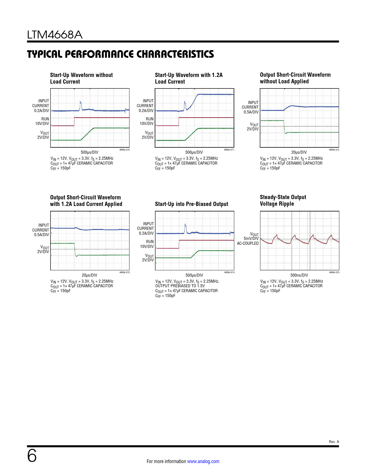 INPUT INPUT CURRENT CURRENT 0.2A/DIV V 0.5A/DIV OUT 5mV/DIV RUN AC-COUPLED VOUT 10V/DIV 2V/DIV VOUT 2V/DIV 4668a G13 4668a G14 4668a G15 20µs/DIV 500µs/DIV 500ns/DIV VIN = 12V, VOUT = 3.3V, fS = 2.25MHz VIN = 12V, VOUT = 3.3V, fS = 2.25MHz, VIN = 12V, VOUT = 3.3V, fS = 2.25MHz COUT = 1× 47µF CERAMIC CAPACITOR OUTPUT PREBIASED TO 1.5V COUT = 1× 47µF CERAMIC CAPACITOR CFF = 150pF COUT = 1× 47µF CERAMIC CAPACITOR CFF = 150pF CFF = 150pF Rev. A 6 For more information www.analog.com Document Outline Features Applications Typical Application Description Absolute Maximum Ratings Order Information Pin Configuration Electrical Characteristics Typical Performance Characteristics Pin Functions Block Diagram Decoupling Requirements Operation Applications Information Typical Applications Package Description Revision History Package Photo Design Resources Related Parts