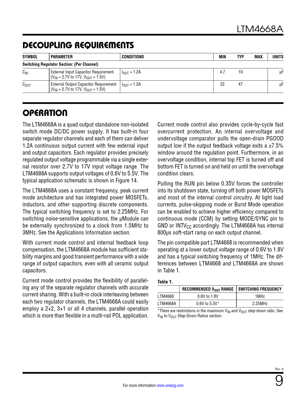 current sharing. With a built-in clock interleaving between LTM4668 0.6V to 1.8V 1MHz each two regulator channels, the LTM4668A could easily LTM4668A 0.6V to 5.5V* 2.25MHz employ a 2+2, 3+1 or all 4 channels, parallel operation *There are restrictions in the maximum V which is more than flexible in a multi-rail POL application. IN and VOUT step-down ratio. See VIN to VOUT Step-Down Ratios section. Rev. A For more information www.analog.com 9 Document Outline Features Applications Typical Application Description Absolute Maximum Ratings Order Information Pin Configuration Electrical Characteristics Typical Performance Characteristics Pin Functions Block Diagram Decoupling Requirements Operation Applications Information Typical Applications Package Description Revision History Package Photo Design Resources Related Parts