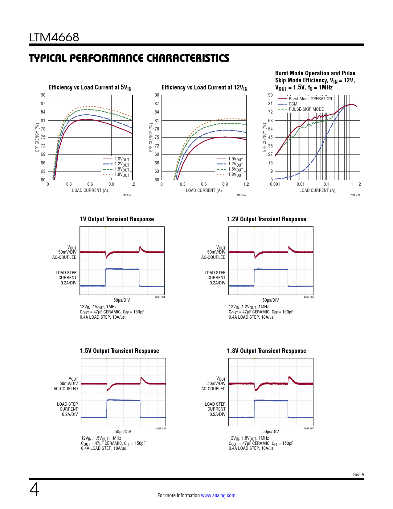 VOUT VOUT 50mV/DIV 50mV/DIV AC-COUPLED AC-COUPLED LOAD STEP LOAD STEP CURRENT CURRENT 0.2A/DIV 0.2A/DIV 4668 G04 4668 G05 50µs/DIV 50µs/DIV 12VIN, 1VOUT, 1MHz 12VIN, 1.2VOUT, 1MHz COUT = 47µF CERAMIC, CFF = 150pF COUT = 47µF CERAMIC, CFF = 150pF 0.4A LOAD STEP, 10A/µs 0.4A LOAD STEP, 10A/µs