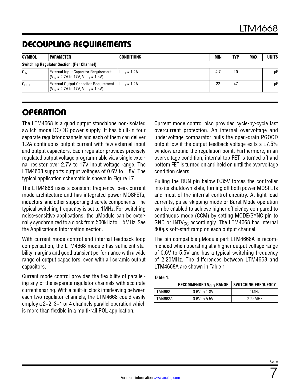 link to page 18 link to page 8 link to page 7 LTM4668 DECOUPLING REQUIREMENTS SYMBOLPARAMETERCONDITIONSMINTYPMAXUNITSSwitching Regulator Section: (Per Channel) CIN External Input Capacitor Requirement IOUT = 1.2A 4.7 10 µF (VIN = 2.7V to 17V, VOUT = 1.5V) COUT External Output Capacitor Requirement IOUT = 1.2A 22 47 µF (VIN = 2.7V to 17V, VOUT = 1.5V) OPERATION The LTM4668 is a quad output standalone non-isolated Current mode control also provides cycle-by-cycle fast switch mode DC/DC power supply. It has built-in four overcurrent protection. An internal overvoltage and separate regulator channels and each of them can deliver undervoltage comparator pulls the open-drain PGOOD 1.2A continuous output current with few external input output low if the output feedback voltage exits a ±7.5% and output capacitors. Each regulator provides precisely window around the regulation point. Furthermore, in an regulated output voltage programmable via a single exter- overvoltage condition, internal top FET is turned off and nal resistor over 2.7V to 17V input voltage range. The bottom FET is turned on and held on until the overvoltage LTM4668 supports output voltages of 0.6V to 1.8V. The condition clears. typical application schematic is shown in Figure 17. Pulling the RUN pin below 0.35V forces the controller The LTM4668 uses a constant frequency, peak current into its shutdown state, turning off both power MOSFETs mode architecture and has integrated power MOSFETs, and most of the internal control circuitry. At light load inductors, and other supporting discrete components. The currents, pulse-skipping mode or Burst Mode operation typical switching frequency is set to 1MHz. For switching can be enabled to achieve higher efficiency compared to noise-sensitive applications, the µModule can be exter- continuous mode (CCM) by setting MODE/SYNC pin to nal y synchronized to a clock from 500kHz to 1.5MHz. See GND or INTVCC accordingly. The LTM4668 has internal the Applications Information section. 800µs soft-start ramp on each output channel. With current mode control and internal feedback loop The pin compatible µModule part LTM4668A is recom- compensation, the LTM4668 module has sufficient sta- mended when operating at a higher output voltage range bility margins and good transient performance with a wide of 0.6V to 5.5V and has a typical switching frequency range of output capacitors, even with all ceramic output of 2.25MHz. The differences between LTM4668 and capacitors. LTM4668A are shown in Table 1. Current mode control provides the flexibility of parallel- Table 1. ing any of the separate regulator channels with accurate RECOMMENDED VOUT RANGE SWITCHING FREQUENCY current sharing. With a built-in clock interleaving between LTM4668 0.6V to 1.8V 1MHz each two regulator channels, the LTM4668 could easily LTM4668A 0.6V to 5.5V 2.25MHz employ a 2+2, 3+1 or 4 channels parallel operation which is more than flexible in a multi-rail POL application. Rev. A For more information www.analog.com 7 Document Outline Features Applications Typical Application Description Absolute Maximum Ratings Order Information Electrical Characteristics Pin Configuration Electrical Characteristics Typical Performance Characteristics Pin Functions Block Diagram Decoupling Requirements Operation Applications Information Package Description Revision History Package Photo Design Resources Related Parts