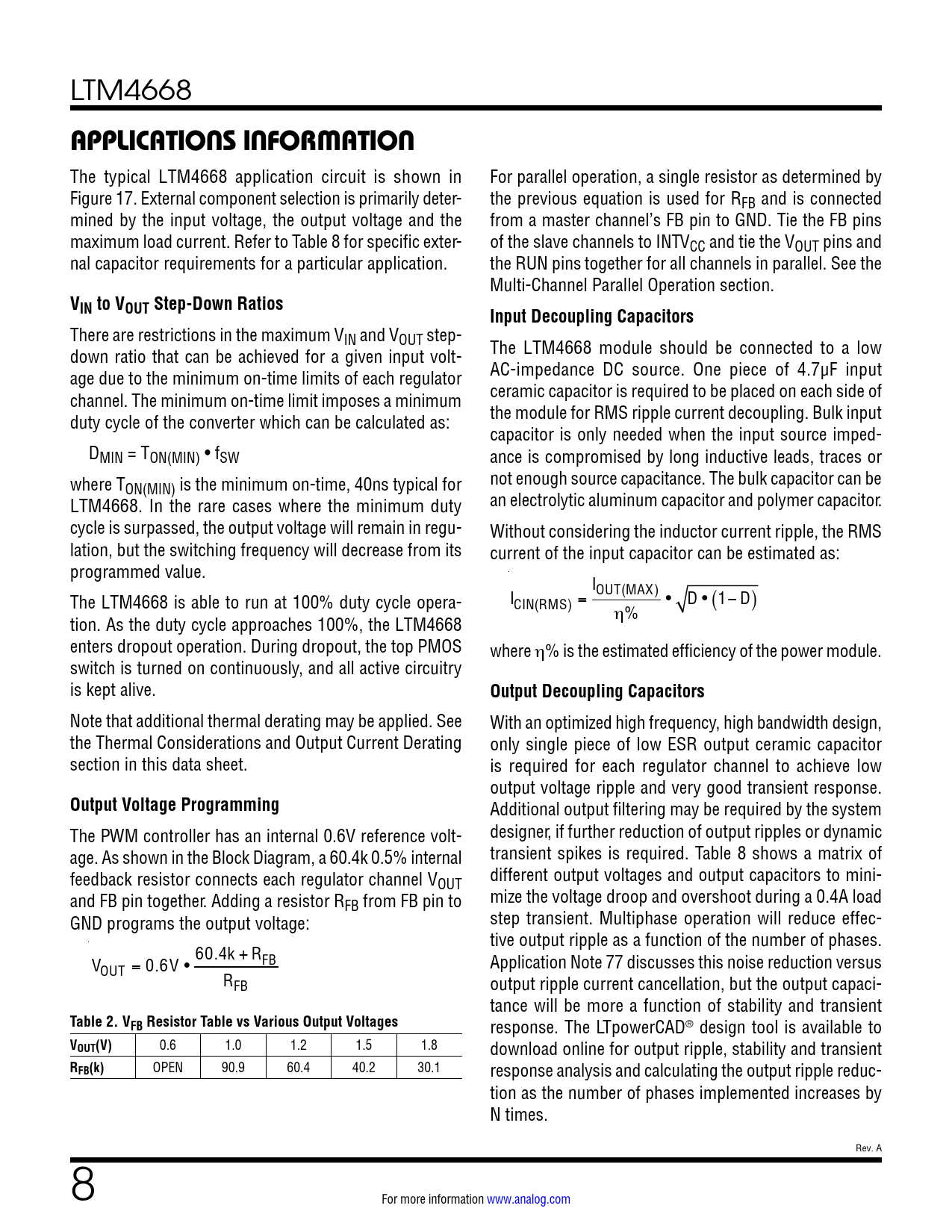link to page 18 link to page 16 link to page 6 link to page 10 link to page 16 LTM4668 APPLICATIONS INFORMATION The typical LTM4668 application circuit is shown in For parallel operation, a single resistor as determined by Figure 17. External component selection is primarily deter- the previous equation is used for RFB and is connected mined by the input voltage, the output voltage and the from a master channel’s FB pin to GND. Tie the FB pins maximum load current. Refer to Table 8 for specific exter- of the slave channels to INTVCC and tie the VOUT pins and nal capacitor requirements for a particular application. the RUN pins together for all channels in parallel. See the Multi-Channel Parallel Operation section. VIN to VOUT Step-Down RatiosInput Decoupling Capacitors There are restrictions in the maximum VIN and VOUT step- down ratio that can be achieved for a given input volt- The LTM4668 module should be connected to a low age due to the minimum on-time limits of each regulator AC-impedance DC source. One piece of 4.7µF input channel. The minimum on-time limit imposes a minimum ceramic capacitor is required to be placed on each side of duty cycle of the converter which can be calculated as: the module for RMS ripple current decoupling. Bulk input capacitor is only needed when the input source imped- DMIN = TON(MIN) • fSW ance is compromised by long inductive leads, traces or where T not enough source capacitance. The bulk capacitor can be ON(MIN) is the minimum on-time, 40ns typical for LTM4668. In the rare cases where the minimum duty an electrolytic aluminum capacitor and polymer capacitor. cycle is surpassed, the output voltage wil remain in regu- Without considering the inductor current ripple, the RMS lation, but the switching frequency will decrease from its current of the input capacitor can be estimated as: programmed value. IOUT(MAX) The LTM4668 is able to run at 100% duty cycle opera- ICIN(RMS) = • D • (1− D) tion. As the duty cycle approaches 100%, the LTM4668 η% enters dropout operation. During dropout, the top PMOS where η% is the estimated efficiency of the power module. switch is turned on continuously, and all active circuitry is kept alive. Output Decoupling Capacitors Note that additional thermal derating may be applied. See With an optimized high frequency, high bandwidth design, the Thermal Considerations and Output Current Derating only single piece of low ESR output ceramic capacitor section in this data sheet. is required for each regulator channel to achieve low output voltage ripple and very good transient response. Output Voltage Programming Additional output filtering may be required by the system The PWM controller has an internal 0.6V reference volt- designer, if further reduction of output ripples or dynamic age. As shown in the Block Diagram, a 60.4k 0.5% internal transient spikes is required. Table 8 shows a matrix of feedback resistor connects each regulator channel V different output voltages and output capacitors to mini- OUT and FB pin together. Adding a resistor R mize the voltage droop and overshoot during a 0.4A load FB from FB pin to GND programs the output voltage: step transient. Multiphase operation will reduce effec- tive output ripple as a function of the number of phases. 60.4k V + RFB Application Note 77 discusses this noise reduction versus OUT = 0.6V • RFB output ripple current cancellation, but the output capaci- tance will be more a function of stability and transient Table 2. VFB Resistor Table vs Various Output Voltages response. The LTpowerCAD® design tool is available to VOUT(V) 0.6 1.0 1.2 1.5 1.8 download online for output ripple, stability and transient RFB(k) OPEN 90.9 60.4 40.2 30.1 response analysis and calculating the output ripple reduc- tion as the number of phases implemented increases by N times. Rev. A 8 For more information www.analog.com Document Outline Features Applications Typical Application Description Absolute Maximum Ratings Order Information Electrical Characteristics Pin Configuration Electrical Characteristics Typical Performance Characteristics Pin Functions Block Diagram Decoupling Requirements Operation Applications Information Package Description Revision History Package Photo Design Resources Related Parts