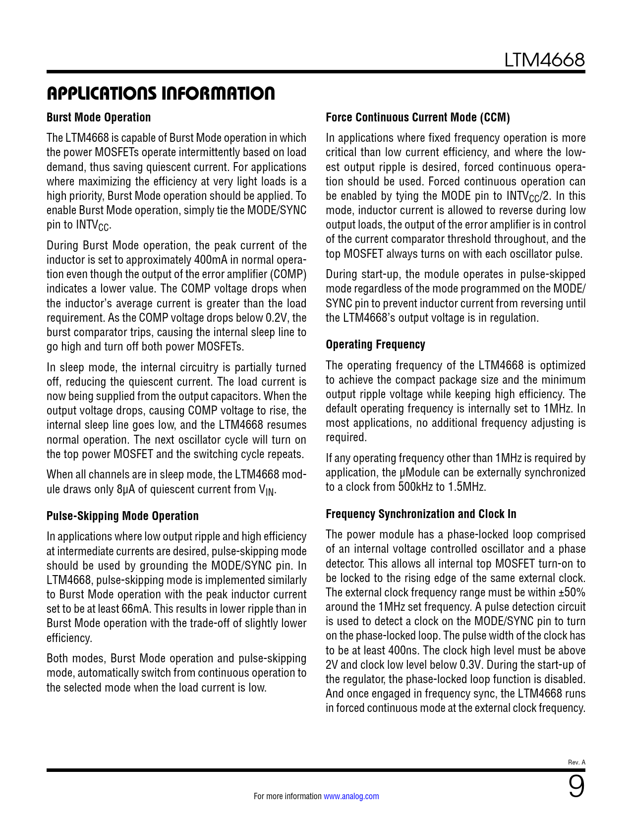 LTM4668 APPLICATIONS INFORMATION Burst Mode OperationForce Continuous Current Mode (CCM) The LTM4668 is capable of Burst Mode operation in which In applications where fixed frequency operation is more the power MOSFETs operate intermittently based on load critical than low current efficiency, and where the low- demand, thus saving quiescent current. For applications est output ripple is desired, forced continuous opera- where maximizing the efficiency at very light loads is a tion should be used. Forced continuous operation can high priority, Burst Mode operation should be applied. To be enabled by tying the MODE pin to INTVCC/2. In this enable Burst Mode operation, simply tie the MODE/SYNC mode, inductor current is allowed to reverse during low pin to INTVCC. output loads, the output of the error amplifier is in control During Burst Mode operation, the peak current of the of the current comparator threshold throughout, and the inductor is set to approximately 400mA in normal opera- top MOSFET always turns on with each oscillator pulse. tion even though the output of the error amplifier (COMP) During start-up, the module operates in pulse-skipped indicates a lower value. The COMP voltage drops when mode regardless of the mode programmed on the MODE/ the inductor’s average current is greater than the load SYNC pin to prevent inductor current from reversing until requirement. As the COMP voltage drops below 0.2V, the the LTM4668’s output voltage is in regulation. burst comparator trips, causing the internal sleep line to go high and turn off both power MOSFETs. Operating Frequency In sleep mode, the internal circuitry is partially turned The operating frequency of the LTM4668 is optimized off, reducing the quiescent current. The load current is to achieve the compact package size and the minimum now being supplied from the output capacitors. When the output ripple voltage while keeping high efficiency. The output voltage drops, causing COMP voltage to rise, the default operating frequency is internally set to 1MHz. In internal sleep line goes low, and the LTM4668 resumes most applications, no additional frequency adjusting is normal operation. The next oscillator cycle will turn on required. the top power MOSFET and the switching cycle repeats. If any operating frequency other than 1MHz is required by When all channels are in sleep mode, the LTM4668 mod- application, the µModule can be externally synchronized ule draws only 8µA of quiescent current from VIN. to a clock from 500kHz to 1.5MHz. Pulse-Skipping Mode OperationFrequency Synchronization and Clock In In applications where low output ripple and high efficiency The power module has a phase-locked loop comprised at intermediate currents are desired, pulse-skipping mode of an internal voltage controlled oscillator and a phase should be used by grounding the MODE/SYNC pin. In detector. This allows all internal top MOSFET turn-on to LTM4668, pulse-skipping mode is implemented similarly be locked to the rising edge of the same external clock. to Burst Mode operation with the peak inductor current The external clock frequency range must be within ±50% set to be at least 66mA. This results in lower ripple than in around the 1MHz set frequency. A pulse detection circuit Burst Mode operation with the trade-off of slightly lower is used to detect a clock on the MODE/SYNC pin to turn efficiency. on the phase-locked loop. The pulse width of the clock has to be at least 400ns. The clock high level must be above Both modes, Burst Mode operation and pulse-skipping 2V and clock low level below 0.3V. During the start-up of mode, automatically switch from continuous operation to the regulator, the phase-locked loop function is disabled. the selected mode when the load current is low. And once engaged in frequency sync, the LTM4668 runs in forced continuous mode at the external clock frequency. Rev. A For more information www.analog.com 9 Document Outline Features Applications Typical Application Description Absolute Maximum Ratings Order Information Electrical Characteristics Pin Configuration Electrical Characteristics Typical Performance Characteristics Pin Functions Block Diagram Decoupling Requirements Operation Applications Information Package Description Revision History Package Photo Design Resources Related Parts