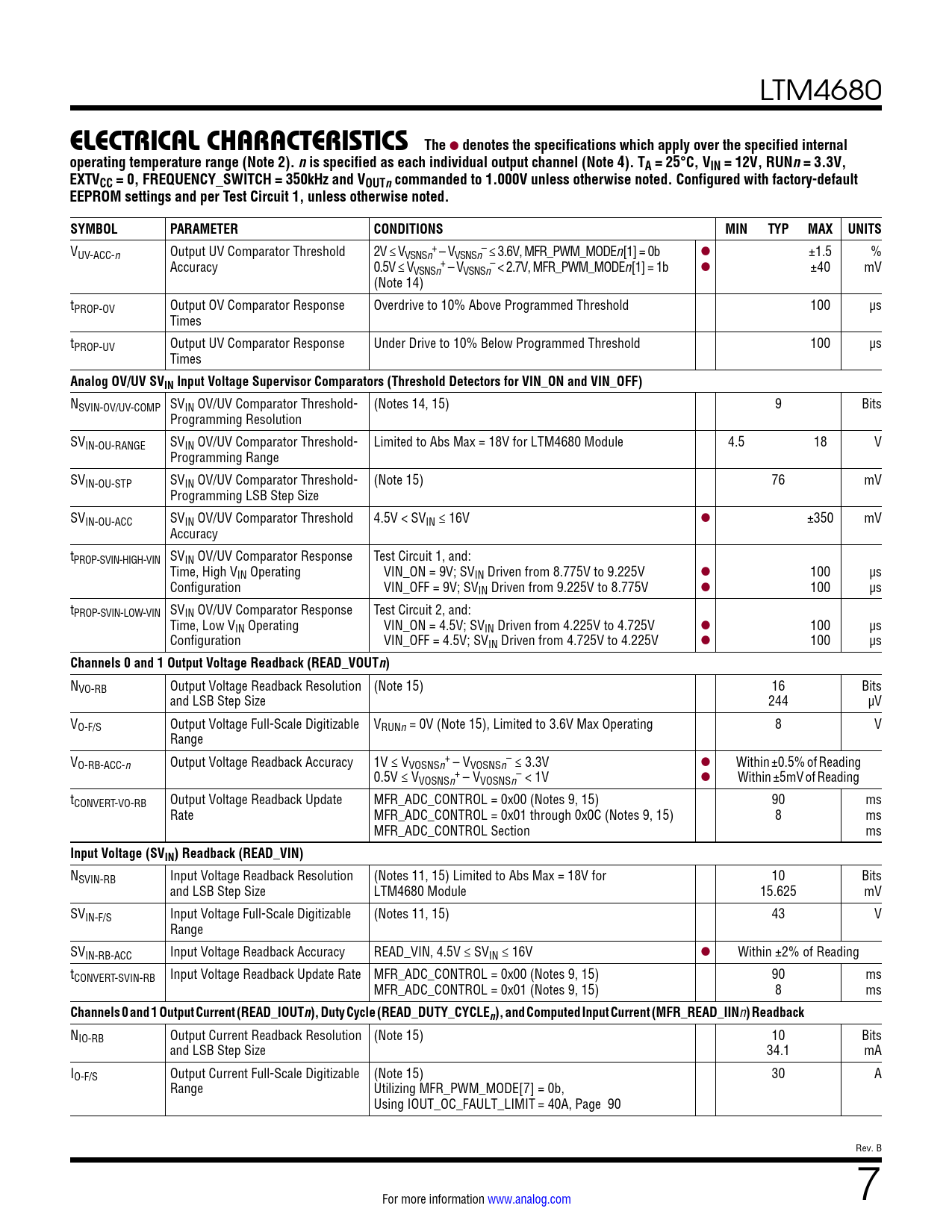 NSVIN-OV/UV-COMP SVIN OV/UV Comparator Threshold- (Notes 14, 15) 9 Bits Programming Resolution SVIN-OU-RANGE SVIN OV/UV Comparator Threshold- Limited to Abs Max = 18V for LTM4680 Module 4.5 18 V Programming Range SVIN-OU-STP SVIN OV/UV Comparator Threshold- (Note 15) 76 mV Programming LSB Step Size SVIN-OU-ACC SVIN OV/UV Comparator Threshold 4.5V < SVIN ≤ 16V l ±350 mV Accuracy tPROP-SVIN-HIGH-VIN SVIN OV/UV Comparator Response Test Circuit 1, and: Time, High VIN Operating VIN_ON = 9V; SVIN Driven from 8.775V to 9.225V l 100 µs Configuration VIN_OFF = 9V; SVIN Driven from 9.225V to 8.775V l 100 µs tPROP-SVIN-LOW-VIN SVIN OV/UV Comparator Response Test Circuit 2, and: Time, Low VIN Operating VIN_ON = 4.5V; SVIN Driven from 4.225V to 4.725V l 100 µs Configuration VIN_OFF = 4.5V; SVIN Driven from 4.725V to 4.225V l 100 µs