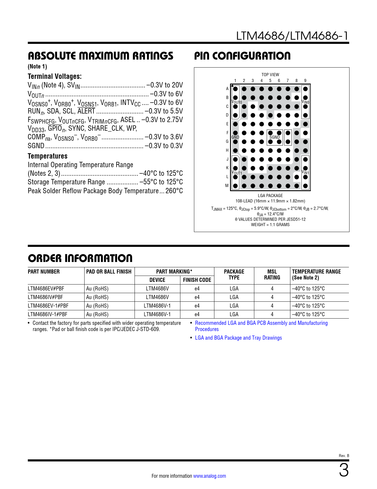 LTM4686/LTM4686-1 ABSOLUTE MAXIMUM RATINGSPIN CONFIGURATION(Note 1) Terminal Voltages: TOP VIEW V 1 2 3 4 5 6 7 8 9 INn (Note 4), SVIN ... –0.3V to 20V A VOUTn ... –0.3V to 6V B V + + OSNS0 , VORB0 , VOSNS1, VORB1, INTVCC .. –0.3V to 6V VOUT0 VIN0 RUN C n, SDA, SCL, ALERT ... –0.3V to 5.5V F D SWPHCFG, VOUTnCFG, VTRIMnCFG, ASEL .. –0.3V to 2.75V V E DD33, GPIOn, SYNC, SHARE_CLK, WP, COMP – – F na, VOSNS0 , VORB0 .. –0.3V to 3.6V GND SGND SGND .. –0.3V to 0.3V G H Temperatures J Internal Operating Temperature Range K (Notes 2, 3) .. –40°C to 125°C VOUT1 VIN1 L Storage Temperature Range .. –55°C to 125°C M Peak Solder Reflow Package Body Temperature ...260°C LGA PACKAGE 108-LEAD (16mm × 11.9mm × 1.82mm) TJMAX = 125°C, θJCtop = 5.9°C/W, θJCbottom = 2°C/W, θJB = 2.7°C/W, θJA = 12.4°C/W θ VALUES DETERMINED PER JESD51-12 WEIGHT = 1.1 GRAMS ORDER INFORMATION PART NUMBERPAD OR BALL FINISHPART MARKING*PACKAGEMSLTEMPERATURE RANGETYPERATING(See Note 2)DEVICEFINISH CODE LTM4686EV#PBF Au (RoHS) LTM4686V e4 LGA 4 –40°C to 125°C LTM4686IV#PBF Au (RoHS) LTM4686V e4 LGA 4 –40°C to 125°C LTM4686EV-1#PBF Au (RoHS) LTM4686V-1 e4 LGA 4 –40°C to 125°C LTM4686IV-1#PBF Au (RoHS) LTM4686V-1 e4 LGA 4 –40°C to 125°C • Contact the factory for parts specified with wider operating temperature • Recommended LGA and BGA PCB Assembly and Manufacturing ranges. *Pad or ball finish code is per IPC/JEDEC J-STD-609. Procedures • LGA and BGA Package and Tray Drawings Rev. B For more information www.analog.com 3 Document Outline Features Applications Typical Application Description Absolute Maximum Ratings Order Information Pin Configuration Electrical Characteristics Typical Performance Characteristics Pin Functions Simplified Block Diagram Decoupling Requirements Functional Diagram Test Circuits Operation Power Module Introduction Power Module Configurability and Readback Data Time-Averaged and Peak Readback Data Power Module Overview EEPROM Serial Interface Device Addressing Fault Detection and Handling Responses to VOUT and IOUT Faults Responses to Timing Faults Responses to SVIN OV Faults Responses to OT/UT Faults Responses to External Faults Fault Logging Bus Timeout Protection PMBus Command Summary PMBus Commands Applications Information VIN to VOUT Step-Down Ratios Input Capacitors Output Capacitors Light Load Current Operation Switching Frequency and Phase Minimum On-Time Considerations Variable Delay Time, Soft-Start and Output Voltage Ramping Digital Servo Mode Soft Off (Sequenced Off) Undervoltage Lockout Fault Detection and Handling Open-Drain Pins Phase-Locked Loop and Frequency Synchronization RCONFIG Pin-Straps (External Resistor Configuration Pins) Voltage Selection Connecting the USB to the I2C/SMBus/PMBus Controller to the LTM4686 In System LTpowerPlay: An Interactive GUI for Digital Power System Management PMBus Communication and Command Processing Thermal Considerations and Output Current Derating EMI Performance Safety Considerations Layout Checklist/Example Typical Applications Appendix A Similarity Between PMBus, SMBus and I2C 2-Wire Interface Appendix B PMBus Serial Digital Interface Appendix C: PMBus Command Details Addressing and Write Protect General Configuration Registers On/Off/Margin PWM Config Voltage Current Temperature Timing Fault Response Fault Sharing Scratchpad Identification Fault Warning and Status Telemetry NVM (EEPROM) Memory Commands Package Description Package Photographs Package Description Revision History Typical Application Design Resources Related Parts