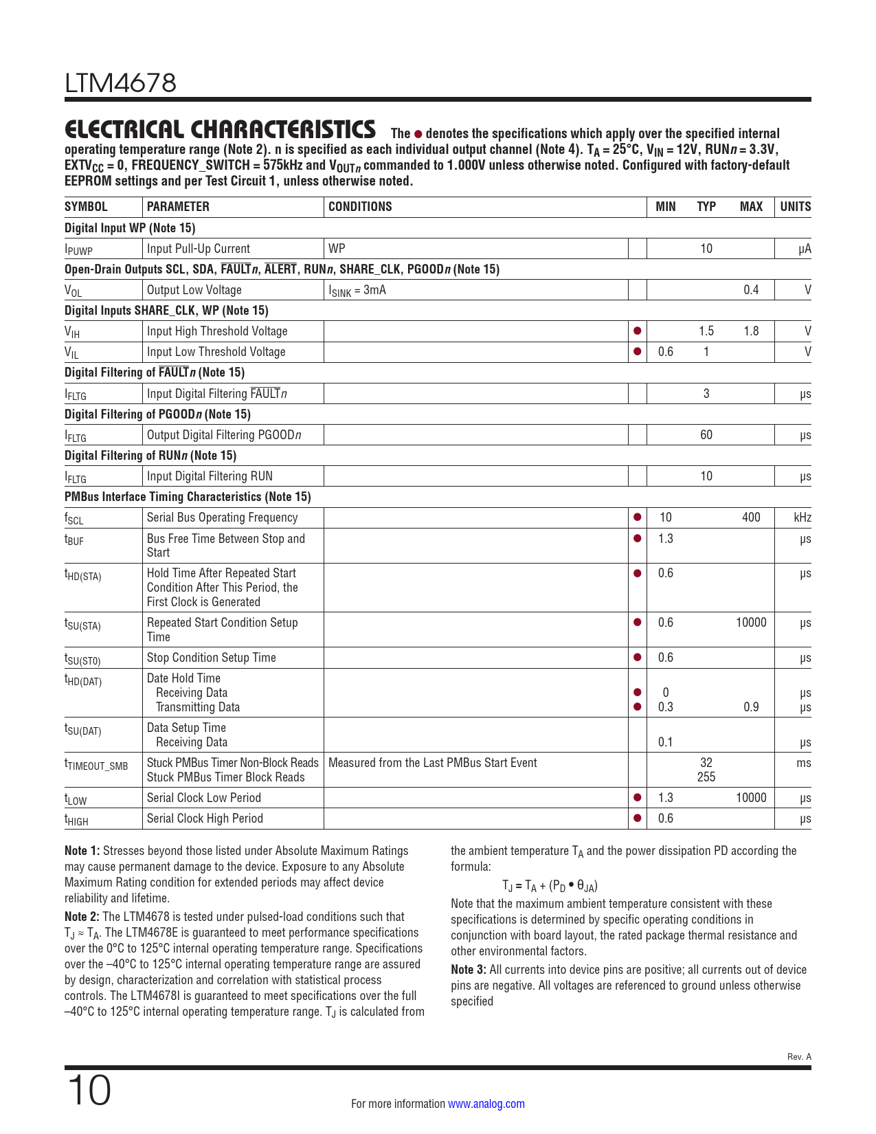 LTM4678 ELECTRICAL CHARACTERISTICSThe l denotes the specifications which apply over the specified internaloperating temperature range (Note 2). n is specified as each individual output channel (Note 4). TA = 25°C, VIN = 12V, RUNn= 3.3V,EXTVCC = 0, FREQUENCY_SWITCH = 575kHz and VOUTncommanded to 1.000V unless otherwise noted. Configured with factory-defaultEEPROM settings and per Test Circuit 1, unless otherwise noted.SYMBOLPARAMETERCONDITIONSMINTYPMAXUNITSDigital Input WP (Note 15) IPUWP Input Pull-Up Current WP 10 µA Open-Drain Outputs SCL, SDA, FAULTn, ALERT, RUNn, SHARE_CLK, PGOODn(Note 15) VOL Output Low Voltage ISINK = 3mA 0.4 V Digital Inputs SHARE_CLK, WP (Note 15) VIH Input High Threshold Voltage l 1.5 1.8 V VIL Input Low Threshold Voltage l 0.6 1 V Digital Filtering of FAULTn(Note 15) IFLTG Input Digital Filtering FAULTn 3 µs Digital Filtering of PGOODn(Note 15) IFLTG Output Digital Filtering PGOODn 60 µs Digital Filtering of RUNn(Note 15) IFLTG Input Digital Filtering RUN 10 µs PMBus Interface Timing Characteristics (Note 15) fSCL Serial Bus Operating Frequency l 10 400 kHz tBUF Bus Free Time Between Stop and l 1.3 µs Start tHD(STA) Hold Time After Repeated Start l 0.6 µs Condition After This Period, the First Clock is Generated tSU(STA) Repeated Start Condition Setup l 0.6 10000 µs Time tSU(ST0) Stop Condition Setup Time l 0.6 µs tHD(DAT) Date Hold Time Receiving Data l 0 µs Transmitting Data l 0.3 0.9 µs tSU(DAT) Data Setup Time Receiving Data 0.1 µs tTIMEOUT_SMB Stuck PMBus Timer Non-Block Reads Measured from the Last PMBus Start Event 32 ms Stuck PMBus Timer Block Reads 255 tLOW Serial Clock Low Period l 1.3 10000 µs tHIGH Serial Clock High Period l 0.6 µs Note 1: Stresses beyond those listed under Absolute Maximum Ratings the ambient temperature TA and the power dissipation PD according the may cause permanent damage to the device. Exposure to any Absolute formula: Maximum Rating condition for extended periods may affect device TJ = TA + (PD • θJA) reliability and lifetime. Note that the maximum ambient temperature consistent with these Note 2: The LTM4678 is tested under pulsed-load conditions such that specifications is determined by specific operating conditions in TJ ≈ TA. The LTM4678E is guaranteed to meet performance specifications conjunction with board layout, the rated package thermal resistance and over the 0°C to 125°C internal operating temperature range. Specifications other environmental factors. over the –40°C to 125°C internal operating temperature range are assured Note 3: All currents into device pins are positive; all currents out of device by design, characterization and correlation with statistical process pins are negative. All voltages are referenced to ground unless otherwise controls. The LTM4678I is guaranteed to meet specifications over the full specified –40°C to 125°C internal operating temperature range. TJ is calculated from Rev. A 10 For more information www.analog.com Document Outline Features Applications Typical Application Description Table of Contents Absolute Maximum Ratings Order Information Pin Configuration Electrical Characteristics Typical Performance Characteristics Pin Functions Simplified Block Diagram Decoupling Requirements Functional Diagram Test Circuits Operation Power Module Introduction Power Module Overview, Major Features EEPROM with ECC Power-Up and Initialization Soft-Start Time-Based Sequencing Voltage-Based Sequencing Shutdown Light-Load Current Operation Switching Frequency and Phase PWM Loop Compensation Output Voltage Sensing INTVCC/EXTVCC Power Output Current Sensing and Sub Milliohm DCR Current Sensing Input Current Sensing PolyPhase Load Sharing External/Internal Temperature Sense RCONFIG (Resistor Configuration) Pins VOUTn _CFG Pin Strapping Look-Up Table for the LTM4678’s Output Voltage, Coarse Setting (Not Applicable if MFR_CONFIG_ALL[6] = 1b) VTRIMn_CFG Pin Strapping Look-Up Table for the LTM4678’s Output Voltage, Fine Adjustment Setting (Not Applicable if MFR_CONFIG_ALL[6] = 1b) FSWPH_CFG Pin Strapping Look-Up Table to Set the LTM4678’s Switching Frequency and Channel Phase-Interleaving Angle (Not Applicable if MFR_CONFIG_ALL[6] = 1b) ASEL Pin Strapping Look-Up Table to Set the LTM4678’s Slave Address (Applicable Regardless of MFR_CONFIG_ALL[6] Setting) LTM4678 MFR_ADDRESS Command Examples Expressed in 7- and 8-Bit Addressing Fault Detection and Handling Status Registers and ALERT Masking Mapping Faults to FAULT Pins Power Good Pins CRC Protection Serial Interface Communication Protection Device Addressing Responses to VOUT and IIN/IOUT Faults Output Overvoltage Fault Response Output Undervoltage Response Peak Output Overcurrent Fault Response Responses to Timing Faults Responses to VIN OV Faults Responses to OT/UT Faults Internal Overtemperature Fault Response External Overtemperature and Undertemperature Fault Response Responses to Input Overcurrent and Output Undercurrent Faults Responses to External Faults Fault Logging Bus Timeout Protection Similarity Between PMBus, SMBus and I2C 2-Wire Interface PMBus Serial Digital Interface Abbreviations of Supported Data Formats Figure 7 to Figure 24 PMBus Protocols PMBus Command Summary PMBus Commands PMBus Commands Summary (Note: The Data Format Abbreviations are Detailed in Table 8) Data Format Abbreviations Applications Information VIN to VOUT Step-Down Ratios Input Capacitors Output Capacitors Light Load Current Operation Switching Frequency and Phase Recommended Switching Frequency for Various VIN-to-VOUT Step-Down Scenarios Output Current Limit Programming Minimum On-Time Considerations Variable Delay Time, Soft-Start and Output Voltage Ramping Digital Servo Mode Soft Off (Sequenced Off) Undervoltage Lockout Fault Detection and Handling Open-Drain Pins Phase-Locked Loop and Frequency Synchronization Input Current Sense Amplifier Programmable Loop Compensation Checking Transient Response PolyPhase Configuration Connect