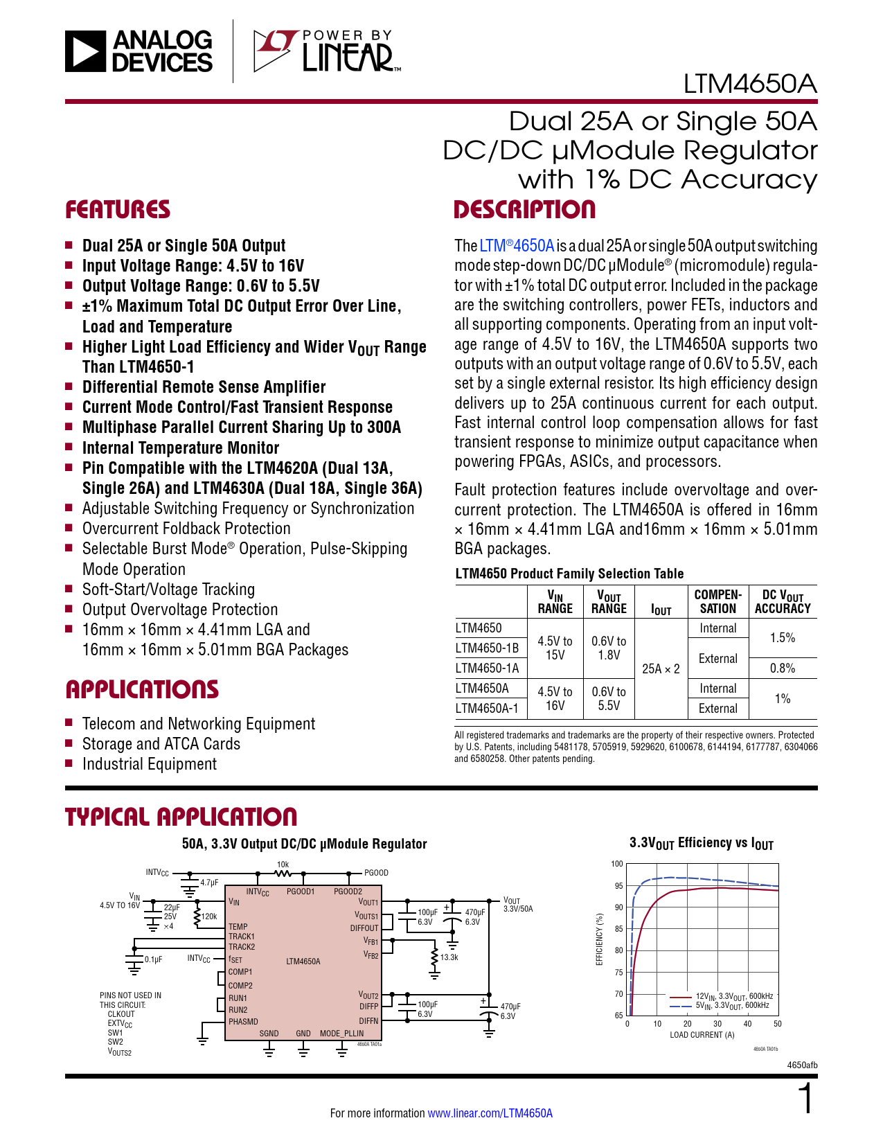 LTM4650A Dual 25A or Single 50A DC/DC µModule Regulator with 1% DC Accuracy FEATURESDESCRIPTION n Dual 25A or Single 50A Output The LTM®4650A is a dual 25A or single 50A output switching n Input Voltage Range: 4.5V to 16V mode step-down DC/DC µModule® (micromodule) regula- n Output Voltage Range: 0.6V to 5.5V tor with ±1% total DC output error. Included in the package n ±1% Maximum Total DC Output Error Over Line, are the switching controllers, power FETs, inductors and Load and Temperature all supporting components. Operating from an input volt- n Higher Light Load Efficiency and Wider V age range of 4.5V to 16V, the LTM4650A supports two OUT RangeThan LTM4650-1 outputs with an output voltage range of 0.6V to 5.5V, each n Differential Remote Sense Amplifier set by a single external resistor. Its high efficiency design n delivers up to 25A continuous current for each output. Current Mode Control/Fast Transient Response n Fast internal control loop compensation allows for fast Multiphase Parallel Current Sharing Up to 300A n transient response to minimize output capacitance when Internal Temperature Monitor n powering FPGAs, ASICs, and processors. Pin Compatible with the LTM4620A (Dual 13A,Single 26A) and LTM4630A (Dual 18A, Single 36A) Fault protection features include overvoltage and over- n Adjustable Switching Frequency or Synchronization current protection. The LTM4650A is offered in 16mm n Overcurrent Foldback Protection × 16mm × 4.41mm LGA and16mm × 16mm × 5.01mm n Selectable Burst Mode® Operation, Pulse-Skipping BGA packages. Mode Operation LTM4650 Product Family Selection Table n Soft-Start/Voltage Tracking VINVOUTCOMPEN-DC VOUT n Output Overvoltage Protection RANGERANGEIOUTSATIONACCURACY n 16mm × 16mm × 4.41mm LGA and LTM4650 Internal 1.5% 16mm × 16mm × 5.01mm BGA Packages 4.5V to 0.6V to LTM4650-1B 15V 1.8V External LTM4650-1A 25A × 2 0.8% APPLICATIONS LTM4650A 4.5V to 0.6V to Internal 16V 5.5V 1% LTM4650A-1 External n Telecom and Networking Equipment All registered trademarks and trademarks are the property of their respective owners. Protected n Storage and ATCA Cards by U.S. Patents, including 5481178, 5705919, 5929620, 6100678, 6144194, 6177787, 6304066 and 6580258. Other patents pending. n Industrial Equipment TYPICAL APPLICATION50A, 3.3V Output DC/DC µModule Regulator3.3VOUT Efficiency vs IOUT 10k 100 INTVCC PGOOD 4.7µF 95 INTVCC PGOOD1 PGOOD2 VIN VIN VOUT1 VOUT 4.5V TO 16V 22µF + 90 100µF 470µF 3.3V/50A 25V 120k VOUTS1 6.3V 6.3V ×4 TEMP DIFFOUT 85 TRACK1 V TRACK2 FB1 80 0.1µF INTVCC f VFB2 SET LTM4650A 13.3k EFFICIENCY (%) COMP1 75 COMP2 PINS NOT USED IN RUN1 VOUT2 + 70 12VIN, 3.3VOUT, 600kHz THIS CIRCUIT: 100µF RUN2 DIFFP 470µF 5VIN, 3.3VOUT, 600kHz CLKOUT 6.3V 6.3V 65 EXTV PHASMD DIFFN CC 0 10 20 30 40 50 SW1 SGND GND MODE_PLLIN LOAD CURRENT (A) SW2 4650A TA01a VOUTS2 4650A TA01b 4650afb For more information www.linear.com/LTM4650A 1