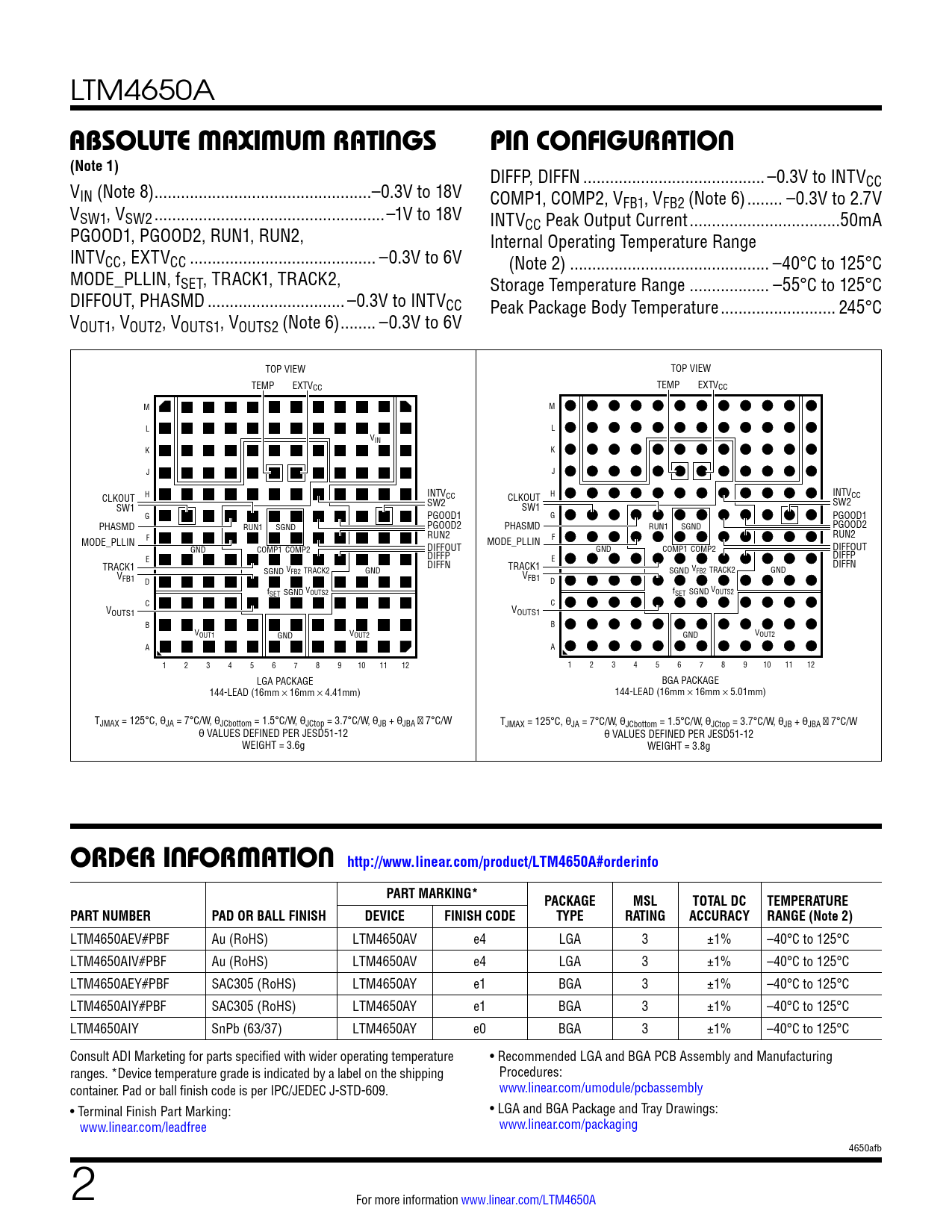 LTM4650A ABSOLUTE MAXIMUM RATINGSPIN CONFIGURATION(Note 1) DIFFP, DIFFN ... –0.3V to INTV V CC IN (Note 8) ...–0.3V to 18V COMP1, COMP2, V V FB1, VFB2 (Note 6) .. –0.3V to 2.7V SW1, VSW2 ..–1V to 18V INTV PGOOD1, PGOOD2, RUN1, RUN2, CC Peak Output Current ..50mA Internal Operating Temperature Range INTVCC, EXTVCC .. –0.3V to 6V (Note 2) ... –40°C to 125°C MODE_PLLIN, fSET, TRACK1, TRACK2, Storage Temperature Range .. –55°C to 125°C DIFFOUT, PHASMD ... –0.3V to INTVCC Peak Package Body Temperature .. 245°C VOUT1, VOUT2, VOUTS1, VOUTS2 (Note 6) .. –0.3V to 6V TOP VIEW TOP VIEW TEMP EXTVCC TEMP EXTVCC M M L L VIN K K J J CLKOUT H INTVCC CLKOUT H INTVCC SW1 SW2 SW1 SW2 G PGOOD1 G PGOOD1 PHASMD RUN1 SGND PGOOD2 PHASMD RUN1 SGND PGOOD2 F RUN2 RUN2 MODE_PLLIN F MODE_PLLIN GND COMP1 COMP2 DIFFOUT GND COMP1 COMP2 DIFFOUT E DIFFP DIFFP DIFFN E TRACK1 DIFFN SGND V TRACK1 FB2 TRACK2 SGND VFB2 TRACK2 GND V GND FB1 V D FB1 D f V f V SET SGND OUTS2 SET SGND OUTS2 C C VOUTS1 VOUTS1 B B VOUT1 V GND OUT2 V GND OUT2 A A 1 2 3 4 5 6 7 8 9 10 11 12 1 2 3 4 5 6 7 8 9 10 11 12 LGA PACKAGE BGA PACKAGE 144-LEAD (16mm × 16mm × 4.41mm) 144-LEAD (16mm × 16mm × 5.01mm) TJMAX = 125°C, θJA = 7°C/W, θJCbottom = 1.5°C/W, θJCtop = 3.7°C/W, θJB + θJBA ≅ 7°C/W TJMAX = 125°C, θJA = 7°C/W, θJCbottom = 1.5°C/W, θJCtop = 3.7°C/W, θJB + θJBA ≅ 7°C/W θ VALUES DEFINED PER JESD51-12 θ VALUES DEFINED PER JESD51-12 WEIGHT = 3.6g WEIGHT = 3.8g ORDER INFORMATION http://www.linear.com/product/LTM4650A#orderinfoPART MARKING*PACKAGEMSLTOTAL DCTEMPERATURE PART NUMBERPAD OR BALL FINISHDEVICEFINISH CODETYPERATINGACCURACY RANGE (Note 2) LTM4650AEV#PBF Au (RoHS) LTM4650AV e4 LGA 3 ±1% –40°C to 125°C LTM4650AIV#PBF Au (RoHS) LTM4650AV e4 LGA 3 ±1% –40°C to 125°C LTM4650AEY#PBF SAC305 (RoHS) LTM4650AY e1 BGA 3 ±1% –40°C to 125°C LTM4650AIY#PBF SAC305 (RoHS) LTM4650AY e1 BGA 3 ±1% –40°C to 125°C LTM4650AIY SnPb (63/37) LTM4650AY e0 BGA 3 ±1% –40°C to 125°C Consult ADI Marketing for parts specified with wider operating temperature • Recommended LGA and BGA PCB Assembly and Manufacturing ranges. *Device temperature grade is indicated by a label on the shipping Procedures: container. Pad or ball finish code is per IPC/JEDEC J-STD-609. www.linear.com/umodule/pcbassembly • Terminal Finish Part Marking: • LGA and BGA Package and Tray Drawings: www.linear.com/leadfree www.linear.com/packaging 4650afb 2 For more information www.linear.com/LTM4650A