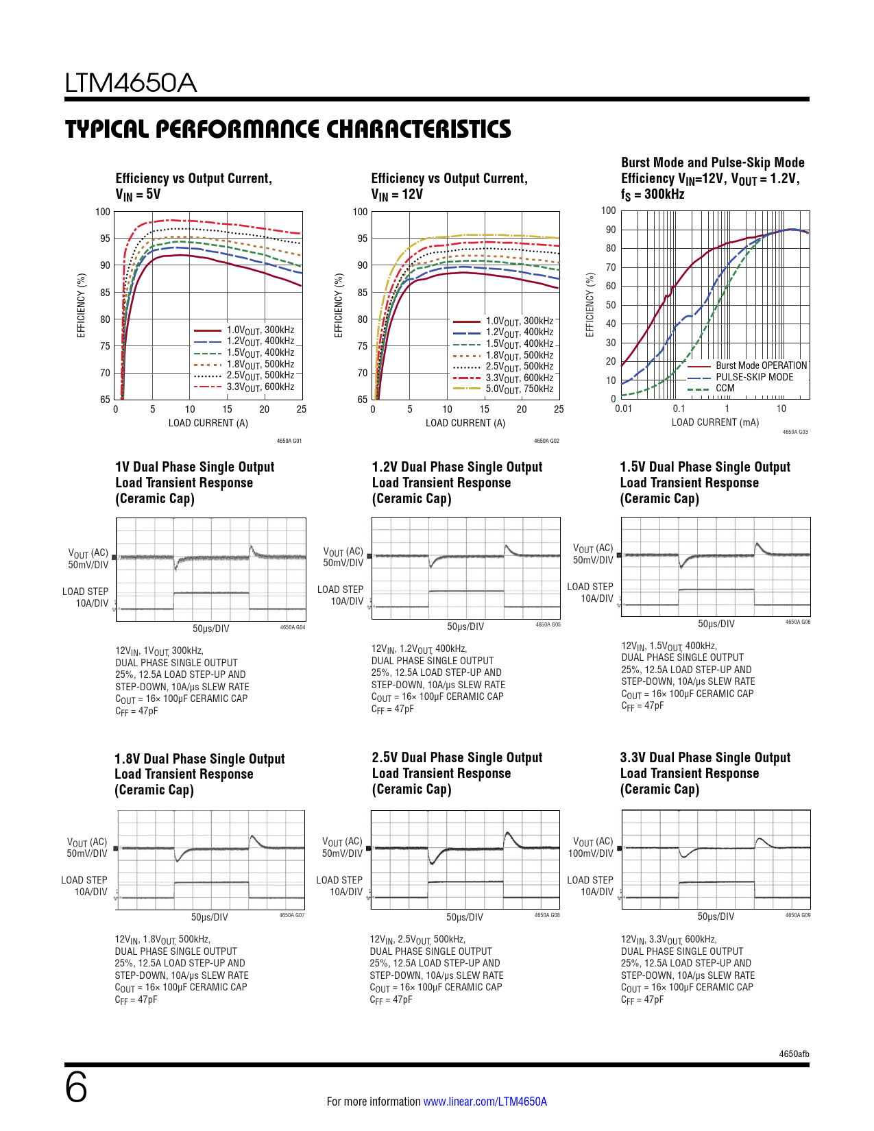 V V OUT (AC) VOUT (AC) OUT (AC) 50mV/DIV 50mV/DIV 50mV/DIV LOAD STEP LOAD STEP LOAD STEP 10A/DIV 10A/DIV 10A/DIV 50µs/DIV 50µs/DIV 4650A G06 4650A G04 50µs/DIV 4650A G05 12V 12V IN, 1VOUT, 300kHz, 12VIN, 1.2VOUT, 400kHz, IN, 1.5VOUT, 400kHz, DUAL PHASE SINGLE OUTPUT DUAL PHASE SINGLE OUTPUT DUAL PHASE SINGLE OUTPUT 25%, 12.5A LOAD STEP-UP AND 25%, 12.5A LOAD STEP-UP AND 25%, 12.5A LOAD STEP-UP AND STEP-DOWN, 10A/μs SLEW RATE STEP-DOWN, 10A/μs SLEW RATE STEP-DOWN, 10A/μs SLEW RATE C C OUT = 16× 100μF CERAMIC CAP COUT = 16× 100μF CERAMIC CAP OUT = 16× 100μF CERAMIC CAP C C FF = 47pF CFF = 47pF FF = 47pF