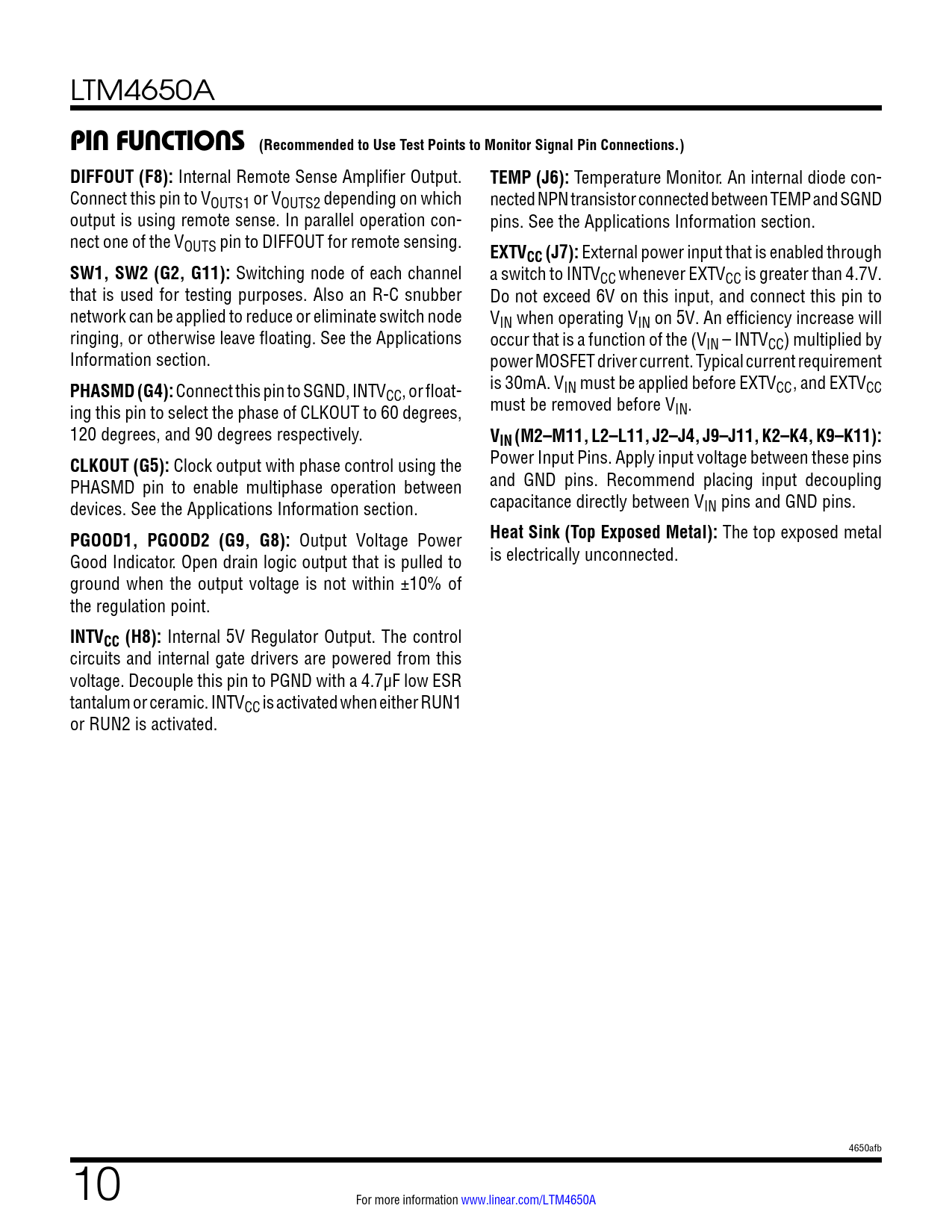 Internal 5V Regulator Output. The control circuits and internal gate drivers are powered from this voltage. Decouple this pin to PGND with a 4.7µF low ESR tantalum or ceramic. INTVCC is activated when either RUN1 or RUN2 is activated. 4650afb 10 For more information www.linear.com/LTM4650A