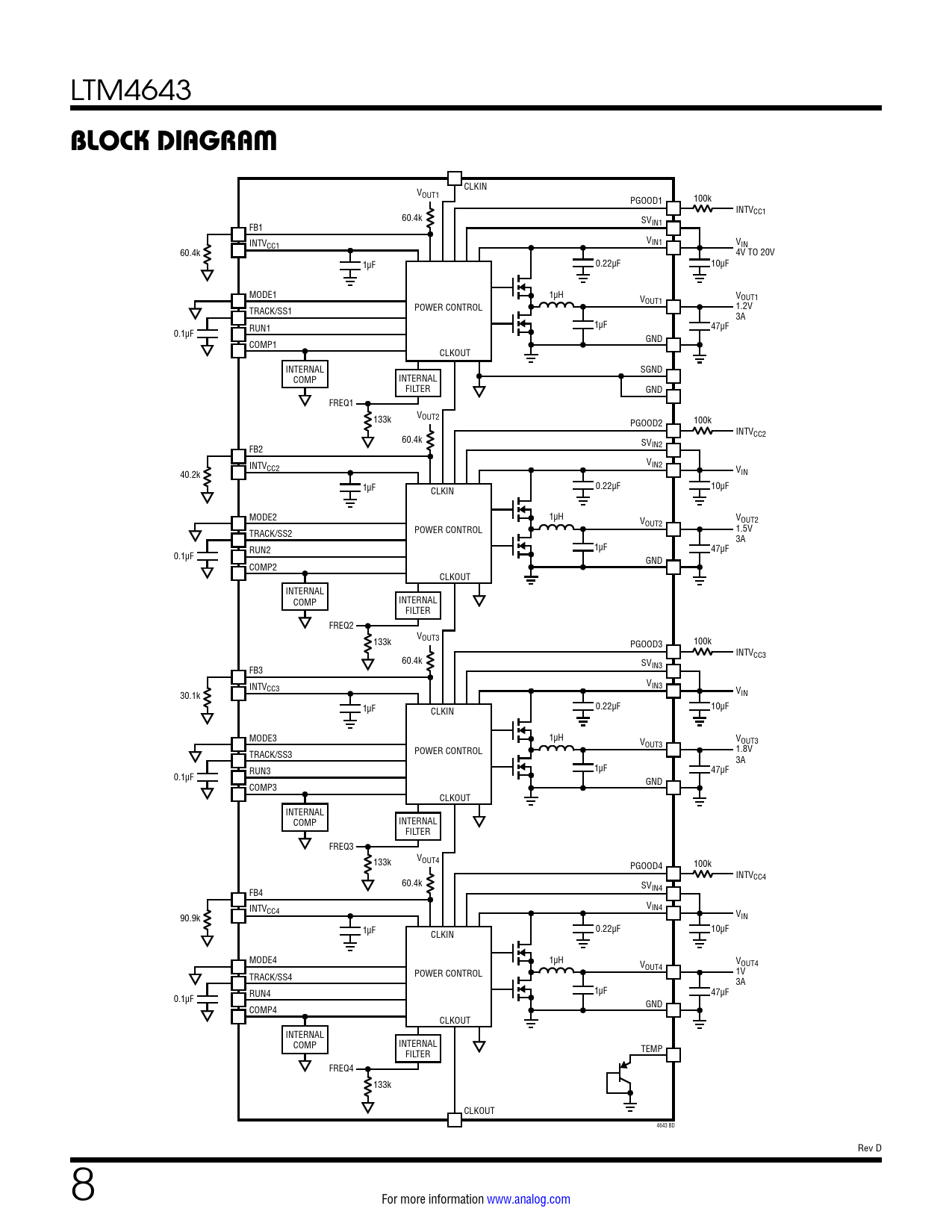 CLKIN VOUT1 100k PGOOD1 INTVCC1 60.4k SV FB1 IN1 INTV V CC1 IN1 VIN 60.4k 4V TO 20V 1µF 0.22µF 10µF MODE1 1µH V V OUT1 OUT1 POWER CONTROL TRACK/SS1 1.2V 3A RUN1 1µF 47µF 0.1µF GND COMP1 CLKOUT INTERNAL SGND COMP INTERNAL FILTER GND FREQ1 133k VOUT2 100k PGOOD2 INTVCC2 60.4k SV FB2 IN2 INTV V CC2 IN2 40.2k VIN 1µF 0.22µF 10µF CLKIN MODE2 1µH V V OUT2 OUT2 POWER CONTROL TRACK/SS2 1.5V 3A RUN2 1µF 47µF 0.1µF GND COMP2 CLKOUT INTERNAL COMP INTERNAL FILTER FREQ2 V 133k OUT3 100k PGOOD3 INTVCC3 60.4k SV FB3 IN3 INTV V CC3 IN3 30.1k VIN 1µF 0.22µF 10µF CLKIN MODE3 1µH V V OUT3 OUT3 POWER CONTROL TRACK/SS3 1.8V 3A RUN3 1µF 47µF 0.1µF GND COMP3 CLKOUT INTERNAL COMP INTERNAL FILTER FREQ3 133k VOUT4 100k PGOOD4 INTVCC4 60.4k SV FB4 IN4 INTV V CC4 IN4 90.9k VIN 1µF 0.22µF 10µF CLKIN MODE4 1µH V V OUT4 OUT4 POWER CONTROL TRACK/SS4 1V 3A RUN4 1µF 47µF 0.1µF GND COMP4 CLKOUT INTERNAL COMP INTERNAL FILTER TEMP FREQ4 133k CLKOUT 4643 BD Rev D 8 For more information www.analog.com Document Outline Features Applications Description Typical Application Absolute Maximum Ratings Pin Configuration Order Information Electrical Characteristics Typical Performance Characteristics Pin Functions Block Diagram Decoupling Requirements Operation Applications Information Typical Applications Package Description Package Photo Related Parts