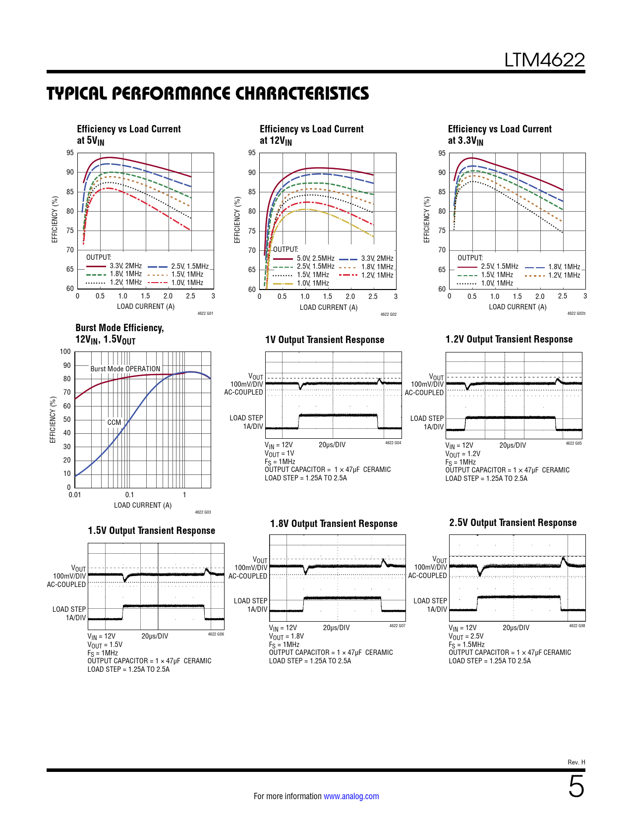 VOUT VOUT VOUT 100mV/DIV 100mV/DIV 100mV/DIV AC-COUPLED AC-COUPLED AC-COUPLED LOAD STEP LOAD STEP LOAD STEP 1A/DIV 1A/DIV 1A/DIV VIN = 12V 20µs/DIV 4622 G07 VIN = 12V 20µs/DIV 4622 G08 VIN = 12V 20µs/DIV 4622 G06 VOUT = 1.8V VOUT = 2.5V VOUT = 1.5V FS = 1MHz FS = 1.5MHz FS = 1MHz OUTPUT CAPACITOR = 1 × 47µF CERAMIC OUTPUT CAPACITOR = 1 × 47µF CERAMIC OUTPUT CAPACITOR = 1 × 47µF CERAMIC LOAD STEP = 1.25A TO 2.5A LOAD STEP = 1.25A TO 2.5A LOAD STEP = 1.25A TO 2.5A Rev. H For more information www.analog.com 5 Document Outline Features Applications Typical Application Description Absolute Maximum Ratings Pin Configuration Order Information Electrical Characteristics Typical Performance Characteristics Pin Functions Block Diagram Decoupling Requirements Operation Applications Information Safety Considerations Layout Checklist/Example Package Description Revision History Package Photo Design Resources Related Parts