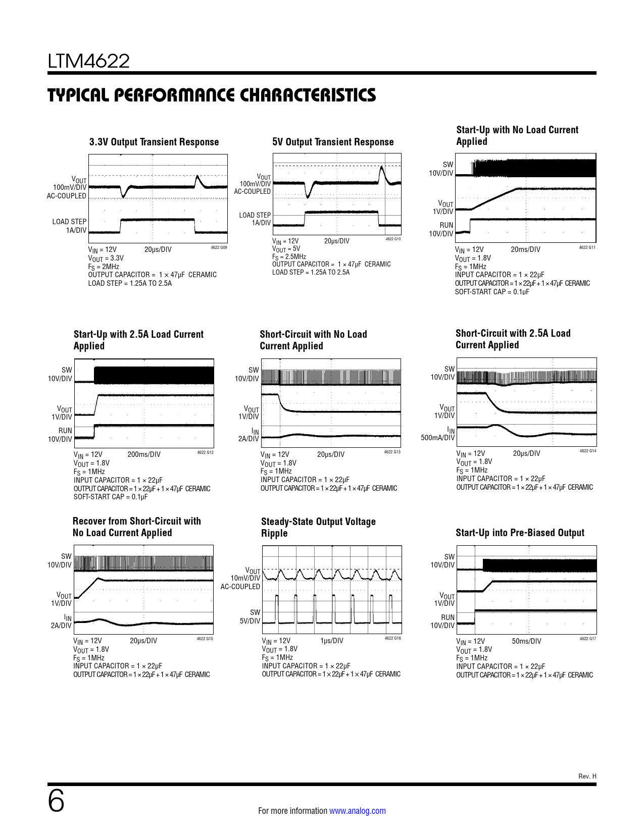 SW SW SW 10V/DIV 10V/DIV 10V/DIV VOUT VOUT VOUT 1V/DIV 1V/DIV 1V/DIV RUN IIN IIN 10V/DIV 2A/DIV 500mA/DIV VIN = 12V 200ms/DIV 4622 G12 VIN = 12V 20µs/DIV 4622 G13 VIN = 12V 20µs/DIV 4622 G14 VOUT = 1.8V VOUT = 1.8V VOUT = 1.8V FS = 1MHz FS = 1MHz FS = 1MHz INPUT CAPACITOR = 1 × 22µF INPUT CAPACITOR = 1 × 22µF INPUT CAPACITOR = 1 × 22µF OUTPUT CAPACITOR = 1 × 22µF + 1 × 47µF CERAMIC OUTPUT CAPACITOR = 1 × 22µF + 1 × 47µF CERAMIC OUTPUT CAPACITOR = 1 × 22µF + 1 × 47µF CERAMIC SOFT-START CAP = 0.1µF