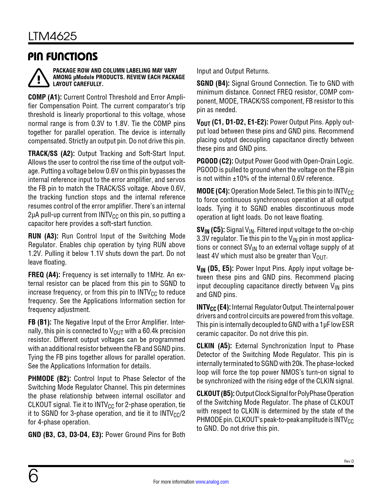 PIN FUNCTIONS. PACKAGE ROW AND COLUMN LABELING MAY VARY. AMONG µModule PRODUCTS. REVIEW EACH PACKAGE. LAYOUT CAREFULLY